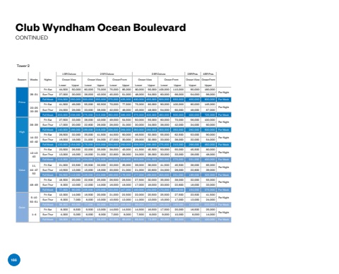 Tower 2Season Weeks Nights1 BR Deluxe 2 BR Deluxe 3 BR Deluxe 2 BR Pres. 4 BR Pres.Ocean View Ocean View Ocean Front Ocean View Ocean Front Ocean View Ocean FrontLower Upper Lower Upper Lower Upper Lower Upper Lower Upper Upper UpperPrime26%u201331Fri-Sat 44,500 50,000 60,000 70,000 75,000 85,000 80,000 90,000 100,000 110,000 90,000 160,000Per Night Sun-Thur 27,000 30,000 36,000 42,000 45,000 51,000 48,000 54,000 60,000 66,000 54,000 96,000Full Week 224,000 250,000 300,000 350,000 375,000 425,000 400,000 450,000 500,000 550,000 450,000 800,000 Per Week23%u20132532%u201335Fri-Sat 41,500 49,000 55,000 62,500 70,000 77,500 75,000 80,000 90,000 100,000 80,000 145,000Per Night Sun-Thur 24,000 28,000 33,000 38,000 42,000 46,000 45,000 48,000 54,000 60,000 48,000 87,000Full Week 203,000 238,000 275,000 315,000 350,000 385,000 375,000 400,000 450,000 500,000 400,000 725,000 Per WeekHigh36%u201339Fri-Sat 27,500 33,000 38,000 43,000 49,000 54,500 50,000 55,000 60,000 70,000 56,000 100,000Per Night Sun-Thur 17,000 20,000 22,600 26,000 28,000 31,000 30,000 34,000 36,000 42,000 34,000 60,000Full Week 140,000 166,000 189,000 216,000 238,000 264,000 250,000 280,000 300,000 350,000 282,000 500,000 Per Week14%u20132240%u201342Fri-Sat 26,500 32,000 35,000 41,500 44,500 50,000 46,500 53,000 55,000 62,500 53,000 90,000Per Night Sun-Thur 16,000 18,000 21,000 24,000 27,000 30,000 29,000 32,000 33,000 38,000 32,000 54,000Full Week 133,000 154,000 175,000 203,000 224,000 250,000 238,000 266,000 275,000 315,000 266,000 450,000 Per WeekValue12%u201313 43Fri-Sat 23,500 26,500 32,000 35,000 38,000 43,000 41,500 45,500 50,000 55,000 45,500 80,000Per Night Sun-Thur 13,000 16,000 18,000 21,000 22,600 26,000 24,000 28,000 30,000 33,000 28,000 48,000Full Week 112,000 133,000 154,000 175,000 189,000 216,000 203,000 231,000 250,000 275,000 231,000 400,000 Per Week11, 44%u20134752Fri-Sat 21,000 23,500 25,500 32,000 33,000 35,000 36,000 38,000 41,500 45,500 38,000 65,000Per Night Sun-Thur 10,500 13,000 15,000 18,000 20,000 21,000 21,000 22,600 24,000 28,000 22,600 39,000Full Week 94,500 112,000 126,000 154,000 166,000 175,000 177,000 189,000 203,000 231,000 189,000 325,000 Per Week48%u201349Fri-Sat 18,500 20,000 22,500 25,000 26,500 28,500 27,500 32,000 35,000 38,000 32,000 55,000Per Night Sun-Thur 8,000 10,000 12,000 14,000 16,000 18,000 17,000 18,000 20,000 22,600 18,000 33,000Full Week 77,000 90,000 105,000 120,000 133,000 147,000 140,000 154,000 170,000 189,000 154,000 275,000 Per WeekQuiet5%u20131050%u201351Fri-Sat 13,000 14,000 18,500 20,000 21,000 22,500 22,000 23,500 25,500 27,500 23,500 41,500Per Night Sun-Thur 6,000 7,000 8,000 10,000 10,500 12,000 11,000 13,000 15,000 17,000 13,000 24,000Full Week 56,000 63,000 77,000 90,000 94,500 105,000 99,000 112,000 126,000 140,000 112,000 203,000 Per Week1%u20134Fri-Sat 8,000 8,500 9,500 13,000 14,000 14,500 14,500 16,500 17,500 20,000 16,500 25,000Per Night Sun-Thur 4,000 5,000 6,000 6,000 7,000 8,000 7,500 8,000 9,000 10,000 8,000 14,000Full Week 36,000 42,000 49,000 56,000 63,000 69,000 66,500 73,000 80,000 90,000 73,000 120,000 Per WeekClub Wyndham Ocean BoulevardCONTINUED166