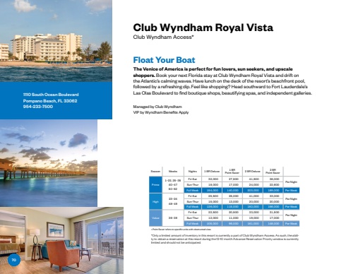 Managed by Club WyndhamVIP by Wyndham Benefits ApplySeason Weeks Nights 1 BR Deluxe 1 BRPoint Saver 2 BR Deluxe 2 BRPoint SaverPrime1%u201322, 25%u20133540%u20134750%u201352Fri-Sat 32,000 27,500 41,500 38,000Per NightSun-Thur 18,000 17,000 24,000 22,600Full Week 154,000 140,000 203,000 189,000 Per WeekHigh23%u20132448%u201349Fri-Sat 25,500 25,000 41,000 33,000Per NightSun-Thur 15,000 13,000 20,000 20,000Full Week 126,000 115,000 182,000 166,000 Per WeekValue 36%u201339Fri-Sat 22,500 20,500 33,000 31,500Per NightSun-Thur 12,000 11,000 19,000 17,000Full Week 105,000 96,000 161,000 148,000 Per Week%u2022 Point Saver refers to specifi c units with obstructed view.Club Wyndham Royal Vista Club Wyndham Access*Float Your Boat The Venice of America is perfect for fun lovers, sun seekers, and upscale shoppers. Book your next Florida stay at Club Wyndham Royal Vista and drift on the Atlantic%u2019s calming waves. Have lunch on the deck of the resort%u2019s beachfront pool, followed by a refreshing dip. Feel like shopping? Head southward to Fort Lauderdale%u2019s Las Olas Boulevard to find boutique shops, beautifying spas, and independent galleries. 1110 South Ocean BoulevardPompano Beach, FL 33062954-233-7500*Only a limited amount of inventory in this resort is currently a part of Club Wyndham Access. As such, the ability to obtain a reservation at this resort during the 13-10 month Advance Reservation Priority window is currently limited and should not be anticipated.70