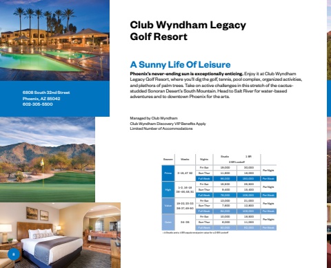 Club Wyndham Legacy Golf Resort6808 South 32nd StreetPhoenix, AZ 85042602-305-5500Managed by Club WyndhamClub Wyndham Discovery VIP Benefits ApplyLimited Number of AccommodationsSeason Weeks NightsStudio 1 BR2 BR Lockoff Prime 3%u201315, 47%ufffd52Fri-Sat 19%ufffd000 30%ufffd000Per NightSun-Thur 11%ufffd600 18%ufffd000Full Week 96%ufffd000 150%ufffd000 Per WeekHigh 1%u20132, 16%u201318 38%u201346, 48, 51Fri-Sat 15%ufffd500 25%ufffd500Per NightSun-Thur 9%ufffd400 15%ufffd400Full Week 78%ufffd000 128%ufffd000 Per WeekValue 19-22, 23-33 36-37, 49-50Fri-Sat 13%ufffd000 21%ufffd000Per NightSun-Thur 7%ufffd600 12%ufffd800Full Week 64%ufffd000 106%ufffd000 Per WeekQuiet 34%u201335Fri-Sat 10%ufffd000 18%ufffd500Per NightSun-Thur 6%ufffd000 11%ufffd000Full Week 50%ufffd000 92%ufffd000 Per Week%u2022 A Studio and a 1 BR equals total point value for a 2 BR Lockoff A Sunny Life Of LeisurePhoenix%u2019s never-ending sun is exceptionally enticing. Enjoy it at Club Wyndham Legacy Golf Resort, where you%u2019ll dig the golf, tennis, pool complex, organized activities, and plethora of palm trees. Take on active challenges in this stretch of the cactusstudded Sonoran Desert%u2019s South Mountain. Head to Salt River for water-based adventures and to downtown Phoenix for the arts.8