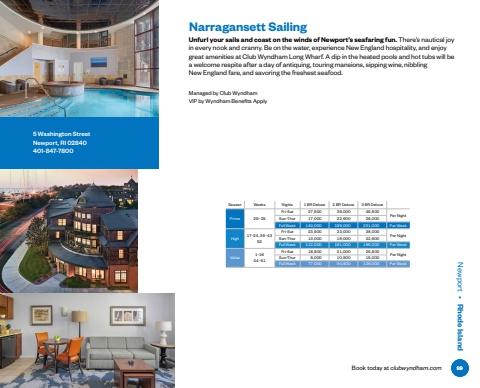 Newport %u2022 Rhode IslandNarragansett SailingManaged by Club WyndhamVIP by Wyndham Benefits ApplyUnfurl your sails and coast on the winds of Newport%u2019s seafaring fun. There%u2019s nautical joy in every nook and cranny. Be on the water, experience New England hospitality, and enjoy great amenities at Club Wyndham Long Wharf. A dip in the heated pools and hot tubs will be a welcome respite after a day of antiquing, touring mansions, sipping wine, nibbling New England fare, and savoring the freshest seafood.Season Weeks Nights 1 BR Deluxe 2 BR Deluxe 3 BR DeluxePrime 25%u201335Fri-Sat 27,500 38,000 45,500Per Night Sun-Thur 17,000 22,600 28,000Full Week 140,000 189,000 231,000 Per WeekHigh 17%u201324, 36%u20134352Fri-Sat 23,500 33,000 38,000Per Night Sun-Thur 13,000 19,000 22,600Full Week 112,000 161,000 189,000 Per WeekValue 1%u20131644%u201351Fri-Sat 18,500 21,000 25,500 Per Night Sun-Thur 8,000 10,500 15,000Full Week 77,000 94,500 126,000 Per Week5 Washington StreetNewport, RI 02840401-847-7800Book today at clubwyndham.com 99