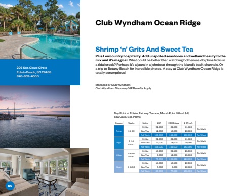 Managed by Club WyndhamClub Wyndham Discovery VIP Benefits ApplyClub Wyndham Ocean Ridge203 Sea Cloud CircleEdisto Beach, SC 29438843-869-4500Shrimp %u2018n%u2019 Grits And Sweet TeaPlus Lowcountry hospitality. Add unspoiled seashores and wetland beauty to the mix and it%u2019s magical. What could be better than watching bottlenose dolphins frolic in a tidal creek? Perhaps it%u2019s a jaunt in a johnboat through the island%u2019s back channels. Or a trip to Botany Beach for incredible photos. A stay at Club Wyndham Ocean Ridge is totally scrumptious!Bay Point at Edisto, Fairway Terrace, Marsh Point Villas I & II, Sea Oaks, Sea PalmsSeason Weeks Nights 1 BR 2 BR Deluxe 2 BR LoftPrime 15%u201343Fri-Sat 22%ufffd500 32%ufffd000 41%ufffd000Per NightSun-Thur 12%ufffd000 18%ufffd000 20%ufffd000Full Week 105%ufffd000 154%ufffd000 182%ufffd000 Per WeekHigh9%u20131444%u201347Fri-Sat 22%ufffd500 32%ufffd000 41%ufffd000Per NightSun-Thur 12%ufffd000 18%ufffd000 20%ufffd000Full Week 105%ufffd000 154%ufffd000 182%ufffd000 Per WeekValue 48%u20134951%u201352Fri-Sat 18%ufffd500 22%ufffd500 25%ufffd500Per NightSun-Thur 8%ufffd000 12%ufffd000 15%ufffd000Full Week 77%ufffd000 105%ufffd000 126%ufffd000 Per WeekQuiet 1%u20138, 50Fri-Sat 14%ufffd000 18%ufffd500 22%ufffd500Per NightSun-Thur 7%ufffd000 8%ufffd000 12%ufffd000Full Week 63%ufffd000 77%ufffd000 105%ufffd000 Per Week100