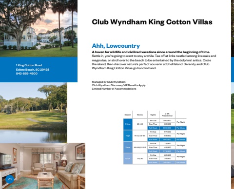 Managed by Club WyndhamClub Wyndham Discovery VIP Benefits ApplyLimited Number of AccommodationsClub Wyndham King Cotton Villas1 King Cotton RoadEdisto Beach, SC 29438843-869-4500Ahh, LowcountryA haven for wildlife and civilized vacations since around the beginning of time. Settle in, you%u2019re going to want to stay a while. Tee off at links nestled among live oaks and magnolias, or stroll over to the beach to be entertained by the dolphins%u2019 antics. Cycle the island, then discover nature%u2019s perfect souvenir at Shell Island. Serenity and Club Wyndham King Cotton Villas go hand in hand.Season Weeks Nights 3 BR PresidentialPrime 15-43Fri- Sat 100%ufffd000Per NightSun-Thur 60%ufffd000Full Week 500%ufffd000 Per WeekHigh 9-14, 44-47Fri-Sat 97%ufffd500Per NightSun-Thur 59%ufffd000Full Week 490%ufffd000 Per WeekValue 48-49, 51-52Fri-Sat 75%ufffd000Per NightSun-Thur 45%ufffd000Full Week 375%ufffd000 Per WeekQuiet 1-8, 50Fri-Sat 60%ufffd000Per NightSun-Thur 36%ufffd000Full Week 300%ufffd000 Per Weekwhite102