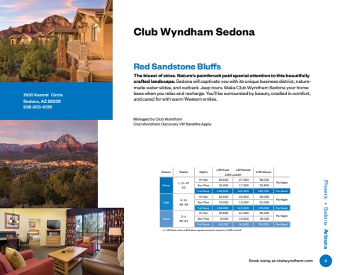 Book today at clubwyndham.comPhoenix %u2022 Sedona ArizonaManaged by Club WyndhamClub Wyndham Discovery VIP Benefits ApplySeason Weeks Nights1 BR Suite 1 BR Deluxe2 BR Deluxe2 BR Lockoff Prime 1, 11%u20134752Fri-Sat 25%ufffd500 27%ufffd500 38%ufffd000Per NightSun-Thur 15%ufffd000 17%ufffd000 22%ufffd600Full Week 126%ufffd000 140%ufffd000 189%ufffd000 Per WeekHigh5%u20131048%u201349Fri-Sat 22%ufffd500 23%ufffd500 35%ufffd000Per NightSun-Thur 12%ufffd000 13%ufffd000 21%ufffd000Full Week 105%ufffd000 112%ufffd000 175%ufffd000 Per WeekValue 2%u2013450%u201351Fri-Sat 19%ufffd500 21%ufffd000 32%ufffd000Per NightSun-Thur 9%ufffd000 10%ufffd500 18%ufffd000Full Week 84%ufffd000 94%ufffd500 154%ufffd000 Per Week%u2022 A 1 BR Suite and a 1 BR Deluxe equals total point value for a 2 BR Lockoff .Club Wyndham SedonaRed Sandstone BluffsThe bluest of skies. Nature%u2019s paintbrush paid special attention to this beautifully crafted landscape. Sedona will captivate you with its unique business district, naturemade water slides, and outback Jeep tours. Make Club Wyndham Sedona your home base when you relax and recharge. You%u2019ll be surrounded by beauty, cradled in comfort, and cared for with warm Western smiles.1500 Kestrel Circle Sedona, AZ 86336928-203-10269
