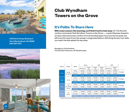 Managed by Club WyndhamClub Wyndham Discovery VIP Benefits ApplyClub Wyndham Towers on the GroveIt%u2019s Polite To Stare HereWith ocean scenery this stunning, you%u2019ll find it hard to look away. On The Strand%u2019s northern end stands Club Wyndham Towers on the Grove %u2014 a quiet hideaway draped in art deco style and homey comfort. It%u2019s truly the ideal place if you love the hot spots, but still crave the resort%u2019s low-key energy. Lounge beachside or drift along the lazy river while you watch the kids splash the day away.2100 North Ocean BoulevardNorth Myrtle Beach, SC 29582843-249-7575 Season Weeks NightsStudio 1 BR 2 BRBoulevard Ocean,viewOceanviewOceanfront Boulevard OceanfrontPrime 20%u20133537%u201343, 52Fri-Sat 25%ufffd500 27%ufffd500 32%ufffd000 35%ufffd000 37%ufffd000 42%ufffd500 Per NightSun-Thur 15%ufffd000 16%ufffd000 18%ufffd000 21%ufffd000 23%ufffd000 26%ufffd000 Full Week 126%ufffd000 135%ufffd000 154%ufffd000 175%ufffd000 189%ufffd000 215%ufffd000 Per WeekHigh 11%u201315Fri-Sat 20%ufffd000 22%ufffd500 25%ufffd500 27%ufffd500 32%ufffd000 35%ufffd000Per NightSun-Thur 13%ufffd000 13%ufffd500 15%ufffd000 17%ufffd000 18%ufffd000 20%ufffd000Full Week 105%ufffd000 112%ufffd500 126%ufffd000 140%ufffd000 154%ufffd000 170%ufffd000 Per WeekValue7%u20131016%u201319, 3644%u201348Fri-Sat 17%ufffd000 18%ufffd500 20%ufffd000 22%ufffd500 26%ufffd500 27%ufffd500Per NightSun-Thur 10%ufffd000 11%ufffd500 13%ufffd000 13%ufffd000 15%ufffd000 17%ufffd000Full Week 84%ufffd000 94%ufffd500 105%ufffd000 110%ufffd000 128%ufffd000 140%ufffd000 Per WeekQuiet1%u2013649%u201351Fri-Sat 14%ufffd000 14%ufffd000 17%ufffd000 18%ufffd500 22%ufffd000 22%ufffd500Per NightSun-Thur 8%ufffd000 9%ufffd000 10%ufffd000 11%ufffd500 12%ufffd000 14%ufffd000 Full Week 68%ufffd000 73%ufffd000 84%ufffd000 94%ufffd500 104%ufffd000 115%ufffd000 Per Week%u2022 A Studio Oceanview and a 2 BR Deluxe Oceanfront equals total point value for a 3 BR Lockoff .112