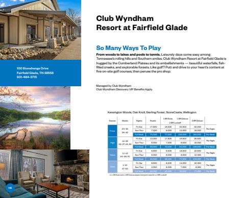 Managed by Club WyndhamClub Wyndham Discovery VIP Benefits Apply100 Stonehenge DriveFairfield Glade, TN 38558931-484-3715So Many Ways To PlayFrom woods to lakes and pools to tennis. Leisurely days come easy among Tennessee%u2019s rolling hills and Southern smiles. Club Wyndham Resort at Fairfield Glade is hugged by the Cumberland Plateau and its embellishments %u2014 beautiful waterfalls, fishfilled creeks, and explorable forests. Like golf? Putt and drive to your heart%u2019s content at five on-site golf courses, then peruse the pro shop.Kensington Woods, Oak Knoll, Sterling Forest, StoneCastle, WellingtonSeason Weeks Nights Studio1 BR Suite 1 BR Deluxe2 BR Deluxe2 BR Lockoff Prime 23%u20133338%u201342Fri-Sat 17%ufffd500 18%ufffd500 22%ufffd500 32%ufffd000Per NightSun-Thur 7%ufffd000 8%ufffd000 12%ufffd000 18%ufffd000Full Week 70%ufffd000 77%ufffd000 105%ufffd000 154%ufffd000 Per WeekHigh 14%u20132234%u201337, 43, 52Fri-Sat 13%ufffd000 17%ufffd500 19%ufffd500 25%ufffd500Per NightSun-Thur 6%ufffd000 7%ufffd000 9%ufffd000 15%ufffd000Full Week 56%ufffd000 70%ufffd000 84%ufffd000 126%ufffd000 Per WeekValue 11%u20131344%u201346, 51Fri-Sat 8%ufffd500 9%ufffd500 18%ufffd500 22%ufffd500Per NightSun-Thur 5%ufffd000 6%ufffd000 8%ufffd000 12%ufffd000Full Week 42%ufffd000 49%ufffd000 77%ufffd000 105%ufffd000 Per WeekQuiet1%u20131047%u201350Fri-Sat 6%ufffd500 8%ufffd500 14%ufffd000 18%ufffd500Per NightSun-Thur 3%ufffd000 5%ufffd000 7%ufffd000 8%ufffd000Full Week 28%ufffd000 42%ufffd000 63%ufffd000 77%ufffd000 Per Week%u2022 A 1 BR Suite and a 1 BR Deluxe equals total point value for a 2 BR Lockoff .Club Wyndham Resort at Fairfield Glade116