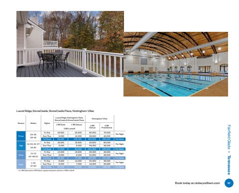 Laurel Ridge, StoneCastle, StoneCastle Place, Nottingham VillasSeason Weeks NightsLaurel Ridge, Nottingham Villas, StoneCastle & StoneCastle Place Nottingham Villas1 BR Suite 1 BR Deluxe 4 BRDeluxe4 BR Presidential 2 BR Lockoff Prime 23%u20133338%u201342Fri-Sat 19%ufffd500 22%ufffd500 60%ufffd000 75%ufffd000Per Night Sun-Thur 9%ufffd000 12%ufffd000 36%ufffd000 40%ufffd000Full Week 84%ufffd000 105%ufffd000 300%ufffd000 350%ufffd000 Per WeekHigh 14%u201322, 34%u20133743, 52Fri-Sat 18%ufffd500 19%ufffd500 45%ufffd500 60%ufffd000Per Night Sun-Thur 8%ufffd000 9%ufffd000 28%ufffd000 36%ufffd000Full Week 77%ufffd000 84%ufffd000 231%ufffd000 300%ufffd000 Per WeekValue 11%u20131344%u201346, 51Fri-Sat 13%ufffd000 18%ufffd500 38%ufffd000 45%ufffd500 Per Night Sun-Thur 6%ufffd000 8%ufffd000 22%ufffd600 28%ufffd000Full Week 56%ufffd000 77%ufffd000 189%ufffd000 231%ufffd000 Per WeekQuiet1%u20131047%u201350Fri-Sat 9%ufffd500 14%ufffd000 32%ufffd000 38%ufffd000 Per Night Sun-Thur 6%ufffd000 7%ufffd000 18%ufffd000 22%ufffd600Full Week 49%ufffd000 63%ufffd000 154%ufffd000 189%ufffd000 Per Week%u2022 A 1 BR Suite and a 1 BR Deluxe equals total point value for a 2 BR Lockoff .Book today at clubwyndham.comFairfield Glade %u2022 Tennessee117