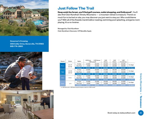 Managed by Club WyndhamClub Wyndham Discovery VIP Benefits ApplySmoky Mountains %u2022 TennesseeGovernor%u2019s Crossing308 Collier Drive, Sevierville, TN 37862865-774-3960Just Follow The TrailSeason Weeks Nights1 BR Suite 1 BR Deluxe 2 BR Deluxe3 BR Deluxe4 BR 2 BR Lockoff PresidentialPrime 21%u20134751%u201352Fri-Sat 19%ufffd500 22%ufffd500 33%ufffd000 41%ufffd500 60%ufffd000Per Night Sun-Thur 9%ufffd000 12%ufffd000 20%ufffd000 24%ufffd000 36%ufffd000Full Week 84%ufffd000 105%ufffd000 166%ufffd000 203%ufffd000 300%ufffd000 Per WeekHigh12%u20132048%u201350Fri-Sat 18%ufffd500 19%ufffd500 31%ufffd500 35%ufffd000 53%ufffd000Per Night Sun-Thur 8%ufffd000 9%ufffd000 17%ufffd000 21%ufffd000 32%ufffd000Full Week 77%ufffd000 84%ufffd000 148%ufffd000 175%ufffd000 266%ufffd000 Per WeekValue 5%u201311Fri-Sat 14%ufffd000 18%ufffd500 25%ufffd500 32%ufffd000 44%ufffd500 Per Night Sun-Thur 7%ufffd000 8%ufffd000 15%ufffd000 18%ufffd000 27%ufffd000Full Week 63%ufffd000 77%ufffd000 126%ufffd000 154%ufffd000 224%ufffd000 Per WeekQuiet 1%u20134Fri-Sat 13%ufffd000 14%ufffd250 22%ufffd500 25%ufffd500 41%ufffd500 Per Night Sun-Thur 6%ufffd000 7%ufffd500 12%ufffd000 15%ufffd000 24%ufffd000Full Week 56%ufffd000 66%ufffd000 105%ufffd000 126%ufffd000 203%ufffd000 Per Week%u2022 A 1 BR Suite and a 1 BR Deluxe equals total point value for a 2 BR Lockoff .Deep amid the forest, you%u2019ll find golf courses, outlet shopping, and Dollywood%u00ae. You%u2019ll also find Club Wyndham Smoky Mountains %u2014 a mountain retreat to treasure. There%u2019s so much fun to be had on site, you may discover you just want to stay put. Who could blame you? With all of the fireside marshmallow roasting, swimming pool splashing, and game room playing, it%u2019s a no-brainer.Book today at clubwyndham.com 121