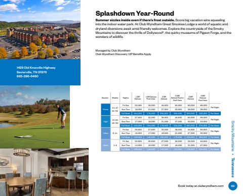 Smoky Mountains %u2022 TennesseeManaged by Club WyndhamClub Wyndham Discovery VIP Benefits Apply1425 Old Knoxville HighwaySevierville, TN 37876865-286-6480Splashdown Year-RoundSeason Weeks Nights 1 BRDeluxe1 BR Deluxe Pool View2 BRDeluxe2 BR Deluxe Pool or Golf View3 BRDeluxe3 BRDeluxePool ViewPrime 21%u20134751%u201352Fri-Sat 32%ufffd000 35%ufffd000 44%ufffd500 50%ufffd000 60%ufffd000 65%ufffd000 Per NightSun-Thur 18%ufffd000 21%ufffd000 27%ufffd000 30%ufffd000 36%ufffd000 39%ufffd000 Full Week 154%ufffd000 175%ufffd000 224%ufffd000 250%ufffd000 300%ufffd000 325%ufffd000 Per WeekHigh12%u20132048%u201350Fri-Sat 27%ufffd500 32%ufffd000 35%ufffd000 44%ufffd500 50%ufffd000 55%ufffd000 Per NightSun-Thur 17%ufffd000 18%ufffd000 21%ufffd000 27%ufffd000 30%ufffd000 33%ufffd000Full Week 140%ufffd000 154%ufffd000 175%ufffd000 224%ufffd000 250%ufffd000 275%ufffd000 Per WeekValue 5%u201311Fri-Sat 25%ufffd500 27%ufffd500 32%ufffd000 35%ufffd000 44%ufffd500 50%ufffd000 Per NightSun-Thur 15%ufffd000 17%ufffd000 18%ufffd000 21%ufffd000 27%ufffd000 30%ufffd000 Full Week 126%ufffd000 140%ufffd000 154%ufffd000 175%ufffd000 224%ufffd000 250%ufffd000 Per WeekQuiet 1%u20134Fri-Sat 22%ufffd500 25%ufffd500 27%ufffd500 32%ufffd000 35%ufffd000 44%ufffd500 Per NightSun-Thur 12%ufffd000 15%ufffd000 17%ufffd000 18%ufffd000 21%ufffd000 27%ufffd000 Full Week 105%ufffd000 126%ufffd000 140%ufffd000 154%ufffd000 175%ufffd000 224%ufffd000 Per WeekSummer sizzles inside even if there%u2019s frost outside. Score big vacation wins squealing into the indoor water park. At Club Wyndham Great Smokies Lodge a world of aquatic and dryland diversions await amid friendly welcomes. Explore the countryside of the Smoky Mountains to discover the thrills of Dollywood%u00ae, the quirky museums of Pigeon Forge, and the wonders of wildlife.Book today at clubwyndham.com 123