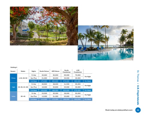 St. Thomas %u2022 U.S. Virgin IslandsSeason Weeks Nights Studio Studio Loft 1 BRPrime 52Fri-Sat 32%ufffd000 34%ufffd000 42%ufffd500Per NightSun-Thur 18%ufffd000 20%ufffd000 24%ufffd000Full Week 154%ufffd000 168%ufffd000 205%ufffd000 Per WeekHigh 1%u201317Fri-Sat 25%ufffd500 32%ufffd000 36%ufffd000Per NightSun-Thur 15%ufffd000 18%ufffd000 22%ufffd000Full Week 126%ufffd000 154%ufffd000 182%ufffd000 Per WeekValue 18%u201351Fri-Sat 22%ufffd500 25%ufffd500 34%ufffd000Per NightSun-Thur 12%ufffd000 15%ufffd000 20%ufffd000Full Week 105%ufffd000 126%ufffd000 168%ufffd000 Per WeekSeason Weeks Nights Studio Deluxe 1BR Deluxe Studio Presidential1 BR PresidentialPrime 1%u201322, 49%u201352Fri-Sat 35%ufffd000 50%ufffd000 55%ufffd000 70%ufffd000Per NightSun-Thur 21%ufffd000 30%ufffd000 33%ufffd000 42%ufffd000Full Week 175%ufffd000 250%ufffd000 275%ufffd000 350%ufffd000 Per WeekHigh 23%u201335, 44%u201348Fri-Sat 26%ufffd500 38%ufffd000 41%ufffd500 55%ufffd000Per NightSun-Thur 16%ufffd000 22%ufffd600 24%ufffd000 33%ufffd000Full Week 133%ufffd000 189%ufffd000 203%ufffd000 275%ufffd000 Per WeekValue 36%u201343Fri-Sat 23%ufffd500 35%ufffd000 38%ufffd000 50%ufffd000Per NightSun-Thur 13%ufffd000 21%ufffd000 22%ufffd600 30%ufffd000Full Week 112%ufffd000 175%ufffd000 189%ufffd000 250%ufffd000 Per WeekBuilding HBook today at clubwyndham.com 133