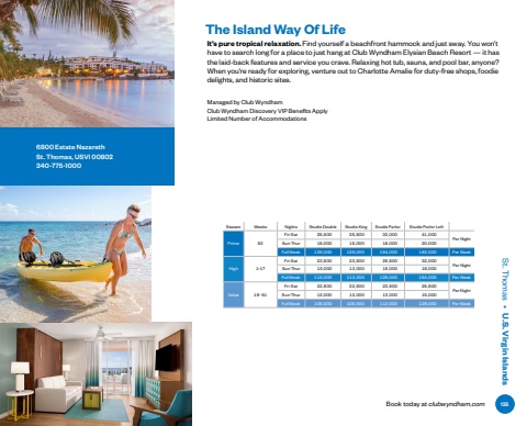 St. Thomas %u2022 U.S. Virgin IslandsThe Island Way Of LifeManaged by Club WyndhamClub Wyndham Discovery VIP Benefits ApplyLimited Number of Accommodations6800 Estate NazarethSt. Thomas, USVI 00802340-775-1000Season Weeks Nights Studio Double Studio King Studio Parlor Studio Parlor LoftPrime 52Fri-Sat 25%ufffd500 25%ufffd500 32%ufffd000 41%ufffd000Per NightSun-Thur 15%ufffd000 15%ufffd000 18%ufffd000 20%ufffd000Full Week 126%ufffd000 126%ufffd000 154%ufffd000 182%ufffd000 Per WeekHigh 1%u201317Fri-Sat 23%ufffd500 23%ufffd500 25%ufffd500 32%ufffd000Per NightSun-Thur 13%ufffd000 13%ufffd000 15%ufffd000 18%ufffd000Full Week 112%ufffd000 112%ufffd000 126%ufffd000 154%ufffd000 Per WeekValue 18%u201351Fri-Sat 22%ufffd500 22%ufffd500 23%ufffd500 25%ufffd500Per NightSun-Thur 12%ufffd000 12%ufffd000 13%ufffd000 15%ufffd000Full Week 105%ufffd000 105%ufffd000 112%ufffd000 126%ufffd000 Per WeekIt%u2019s pure tropical relaxation. Find yourself a beachfront hammock and just sway. You won%u2019t have to search long for a place to just hang at Club Wyndham Elysian Beach Resort %u2014 it has the laid-back features and service you crave. Relaxing hot tub, sauna, and pool bar, anyone? When you%u2019re ready for exploring, venture out to Charlotte Amalie for duty-free shops, foodie delights, and historic sites.Book today at clubwyndham.com 135