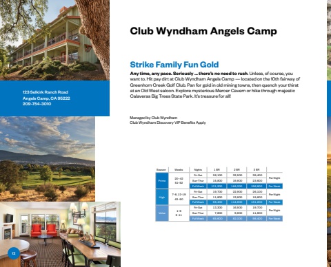 Managed by Club WyndhamClub Wyndham Discovery VIP Benefits ApplyClub Wyndham Angels CampStrike Family Fun GoldAny time, any pace. Seriously %u2026 there%u2019s no need to rush. Unless, of course, you want to. Hit pay dirt at Club Wyndham Angels Camp %u2014 located on the 10th fairway of Greenhorn Creek Golf Club. Pan for gold in old mining towns, then quench your thirst at an Old West saloon. Explore mysterious Mercer Cavern or hike through majestic Calaveras Big Trees State Park. It%u2019s treasure for all! 123 Selkirk Ranch RoadAngels Camp, CA 95222209-754-3010Season Weeks Nights 1 BR 2 BR 3 BRPrime 20%u20134251%u201352Fri-Sat 26%ufffd100 32%ufffd500 39%ufffd400Per NightSun-Thur 15%ufffd800 19%ufffd800 23%ufffd600Full Week 131%ufffd200 164%ufffd000 196%ufffd800 Per WeekHigh 7%u20138, 12%u20131943%u201350Fri-Sat 19%ufffd700 22%ufffd900 26%ufffd100Per NightSun-Thur 11%ufffd800 13%ufffd800 15%ufffd800Full Week 98%ufffd400 114%ufffd800 131%ufffd200 Per WeekValue 1%u201369%u201311Fri-Sat 13%ufffd300 16%ufffd500 19%ufffd700Per NightSun-Thur 7%ufffd800 9%ufffd800 11%ufffd800Full Week 65%ufffd600 82%ufffd000 98%ufffd400 Per Week12