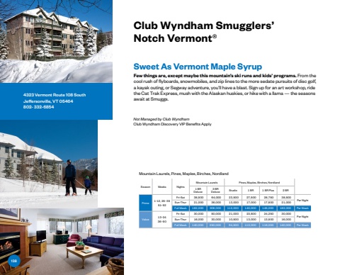 Not Managed by Club WyndhamClub Wyndham Discovery VIP Benefits ApplyClub Wyndham Smugglers%u2019 Notch Vermont%u00ae4323 Vermont Route 108 SouthJeffersonville, VT 05464802- 332-6854Sweet As Vermont Maple Syrup Few things are, except maybe this mountain%u2019s ski runs and kids%u2019 programs. From the cool rush of flyboards, snowmobiles, and zip lines to the more sedate pursuits of disc golf, a kayak outing, or Segway adventure, you%u2019ll have a blast. Sign up for an art workshop, ride the Cat Trak Express, mush with the Alaskan huskies, or hike with a llama %u2014 the seasons await at Smuggs.Mountain Laurels, Pines, Maples, Birches, NordlandSeason Weeks NightsMountain Laurels Pines, Maples, Birches, Nordland1 BRDeluxe3 BRDeluxe Studio 1 BR 1 BR Plus 2 BRPrime 1%u201312, 25%u20133551%u201352Fri-Sat 38%ufffd500 64%ufffd000 23%ufffd500 27%ufffd500 28%ufffd750 38%ufffd500Per NightSun-Thur 21%ufffd000 36%ufffd000 13%ufffd000 17%ufffd000 17%ufffd500 21%ufffd000Full Week 182%ufffd000 308%ufffd000 112%ufffd000 140%ufffd000 145%ufffd000 182%ufffd000 Per WeekValue 13%u20132436%u201350Fri-Sat 30%ufffd000 50%ufffd000 21%ufffd000 23%ufffd500 24%ufffd250 30%ufffd000Per NightSun-Thur 16%ufffd000 30%ufffd000 10%ufffd500 13%ufffd000 13%ufffd500 16%ufffd000Full Week 140%ufffd000 250%ufffd000 94%ufffd500 112%ufffd000 116%ufffd000 140%ufffd000 Per Week138
