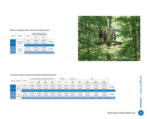 Book today at clubwyndham.comSmugglers%u2019 Notch %u2022 VermontWillows, Evergreen, Oaks, Commons, VillmarksaunaSeason Weeks NightsWillows, Evergreen, Oaks,Commons, Villmarksauna2 BR 3 BRPrime 1%u201312, 25%u20133551%u201352Fri-Sat 32%ufffd000 39%ufffd500Per NightSun-Thur 18%ufffd000 22%ufffd000Full Week 154%ufffd000 189%ufffd000 Per WeekValue 13%u20132436%u201350Fri-Sat 25%ufffd500 32%ufffd000Per NightSun-Thur 15%ufffd000 18%ufffd000Full Week 126%ufffd000 154%ufffd000 Per WeekTamaracks, Aspens, Sycamores, Balsams, Kestrels and OwlsSeason Weeks NightsTamaracks, Aspens, Kestrels & Sycamores Balsams Kestrels OwlsStudio 1 BRDeluxe2 BRDeluxe3 BRDeluxe 2 BR 3 BR 3 BRSuite3 BR Plus2 BRPresidential3 BRPresidential4 BRPresidentialPrime1%u20131224%u20133451%u201352Fri-Sat 25%ufffd500 38%ufffd500 44%ufffd500 64%ufffd000 32%ufffd000 39%ufffd500 70%ufffd000 80%ufffd000 80%ufffd000 90%ufffd000 110%ufffd000Per NightSun-Thur 15%ufffd000 21%ufffd000 27%ufffd000 36%ufffd000 18%ufffd000 22%ufffd000 42%ufffd000 48%ufffd000 48%ufffd000 54%ufffd000 66%ufffd000Full Week 126%ufffd000 182%ufffd000 224%ufffd000 308%ufffd000 154%ufffd000 189%ufffd000 350%ufffd000 400%ufffd000 400%ufffd000 450%ufffd000 550%ufffd000 Per WeekValue 13%u20132335%u201350Fri-Sat 22%ufffd500 30%ufffd000 36%ufffd000 50%ufffd000 25%ufffd500 32%ufffd000 60%ufffd000 70%ufffd000 65%ufffd000 75%ufffd000 90%ufffd000Per NightSun-Thur 12%ufffd000 16%ufffd000 22%ufffd000 30%ufffd000 15%ufffd000 18%ufffd000 36%ufffd000 42%ufffd000 39%ufffd000 45%ufffd000 54%ufffd000Full Week 105%ufffd000 140%ufffd000 182%ufffd000 250%ufffd000 126%ufffd000 154%ufffd000 300%ufffd000 350%ufffd000 325%ufffd000 375%ufffd000 450%ufffd000 Per Week139