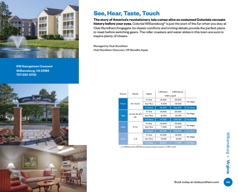 Managed by Club WyndhamClub Wyndham Discovery VIP Benefits ApplyWilliamsburg %u2022 VirginiaSee, Hear, Taste, Touch619 Georgetown CrescentWilliamsburg, VA 23185757-220-5702Season Weeks Nights1 BR Suite 2 BR Deluxe3 BR Lockoff Prime 23%u201334, 51Fri-Sat 19%ufffd500 32%ufffd000Per NightSun-Thur 9%ufffd000 18%ufffd000Full Week 84%ufffd000 154%ufffd000 Per WeekHigh 12%u201322, 35%u20135052Fri-Sat 18%ufffd500 25%ufffd500Per NightSun-Thur 8%ufffd000 15%ufffd000Full Week 77%ufffd000 126%ufffd000 Per WeekValue 9%u201311Fri-Sat 14%ufffd000 22%ufffd500Per NightSun-Thur 7%ufffd000 12%ufffd000Full Week 63%ufffd000 105%ufffd000 Per WeekQuiet 1%u20138Fri-Sat 13%ufffd000 18%ufffd500Per NightSun-Thur 6%ufffd000 8%ufffd000Full Week 56%ufffd000 77%ufffd000 Per Week%u2022 A 1 BR Suite and a 2 BR Deluxe equals total point value for a 3 BR Lockoff .The story of America%u2019s revolutionary tale comes alive as costumed Colonials recreate history before your eyes. Colonial Williamsburg%u00ae is just the start of the fun when you stay at Club Wyndham Kingsgate. Its classic comforts and inviting details provide the perfect place to reset before switching gears. The roller coasters and water slides in this town are sure to inspire plenty of cheers.Book today at clubwyndham.com 143