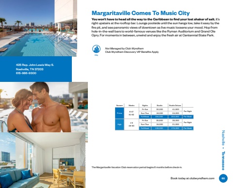 Season Weeks Nights Studio Studio DeluxePrime 6-4751-52Fri-Sat 32%ufffd000 41%ufffd500Per NightSun-Thur 18%ufffd000 24%ufffd000Full Week 154%ufffd000 203%ufffd000 Per WeekHigh1-548-50Fri-Sat 25%ufffd500 35%ufffd000Per NightSun-Thur 15%ufffd000 21%ufffd000Full Week 126%ufffd000 175%ufffd000 Per WeekCityNot Managed by Club WyndhamClub Wyndham Discovery VIP Benefits ApplyNashville %u2022 TennesseeYou won%u2019t have to head all the way to the Caribbean to find your lost shaker of salt. It%u2019s right upstairs at the rooftop bar. Lounge poolside until the sun hangs low, take it easy by the fire pit, and see panoramic views of downtown as live music loosens your mood. Hop from hole-in-the-wall bars to world-famous venues like the Ryman Auditorium and Grand Ole Opry. For moments in between, unwind and enjoy the fresh air at Centennial State Park. Margaritaville Comes To Music City425 Rep. John Lewis Way S. Nashville, TN 37203 615-986-9300 Book today at clubwyndham.comThe Margaritaville Vacation Club reservation period begins 6 months before check-in.155