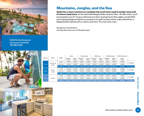 Book today at clubwyndham.comRio Grande %u2022 Puerto RicoSettle into a resort exerience so complete that you%u2019ll never need to wander away until it%u2019s time to head home. At the beachside Margaritaville Vacation Club - Rio Mar resort, you%u2019ll be tempted to tour El Yunque rainforest and other exciting Puerto Rico sights, yet this 500-acre tropical playground gives you access to two golf courses, tennis, a spa, beachfront, a Margaritaville-inspired pool, a casino, and more. You may never roam. Mountains, Jungles, and the SeaManaged by Club WyndhamClub Wyndham Discovery VIP Benefits Apply6000 Rio Mar BoulevardRio Grande, PR 00745787-888-6000Season Weeks NightsStudio Studio Deluxe 1 BR Deluxe 1 BR Presidential 3 BR PresidentialMountain ViewOceanViewMountain ViewOceanViewMountain ViewOceanViewMountain ViewOceanViewOceanViewPrime 1-19, 27-3450-52Fri-Sat 35%ufffd000 38%ufffd000 42%ufffd500 44%ufffd500 50%ufffd000 53%ufffd000 65%ufffd000 70%ufffd000 110%ufffd000Per NightSun-Thur 21%ufffd000 22%ufffd600 25%ufffd000 27%ufffd000 30%ufffd000 32%ufffd000 39%ufffd000 42%ufffd000 66%ufffd000Full Week 175%ufffd000 189%ufffd000 210%ufffd000 224%ufffd000 250%ufffd000 266%ufffd000 325%ufffd000 350%ufffd000 550%ufffd000 Per WeekHigh20-2644-49Fri-Sat 26%ufffd500 27%ufffd500 32%ufffd000 33%ufffd000 38%ufffd000 41%ufffd500 50%ufffd000 55%ufffd000 85%ufffd000Per NightSun-Thur 16%ufffd000 17%ufffd000 18%ufffd000 20%ufffd000 22%ufffd600 24%ufffd000 30%ufffd000 33%ufffd000 51%ufffd000Full Week 133%ufffd000 140%ufffd000 154%ufffd000 166%ufffd000 189%ufffd000 203%ufffd000 250%ufffd000 275%ufffd000 425%ufffd000 Per WeekValue 35-43Fri-Sat 22%ufffd500 25%ufffd000 27%ufffd500 32%ufffd000 33%ufffd000 38%ufffd500 45%ufffd000 50%ufffd000 70%ufffd000Per NightSun-Thur 13%ufffd000 14%ufffd000 17%ufffd000 18%ufffd000 20%ufffd000 21%ufffd000 27%ufffd000 30%ufffd000 42%ufffd000Full Week 110%ufffd000 120%ufffd000 140%ufffd000 154%ufffd000 166%ufffd000 182%ufffd000 225%ufffd000 250%ufffd000 350%ufffd000 Per Week157