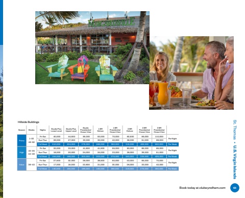 Book today at clubwyndham.comSt. Thomas %u2022 U.S. Virgin IslandsHillside BuildingsSeason Weeks Nights Studio Plus Lower LevelStudio Plus Upper LevelStudio Presidential Ocean View1 BR Deluxe1 BR PresidentialOcean View2 BR Deluxe2 BR PresidentialOcean View3 BR Presidential Ocean ViewPrime 1%u20132249%u201352Fri-Sat 40%ufffd000 44%ufffd500 55%ufffd000 53%ufffd000 70%ufffd000 62%ufffd500 85%ufffd000 110%ufffd000Per NightSun-Thur 26%ufffd000 27%ufffd000 33%ufffd000 32%ufffd000 42%ufffd000 38%ufffd000 51%ufffd000 66%ufffd000Full Week 210%ufffd000 224%ufffd000 275%ufffd000 266%ufffd000 350%ufffd000 315%ufffd000 425%ufffd000 550%ufffd000 Per WeekHigh23%u20133544%u201348Fri-Sat 32%ufffd000 33%ufffd000 41%ufffd500 41%ufffd500 55%ufffd000 50%ufffd000 65%ufffd000 85%ufffd000Per NightSun-Thur 18%ufffd000 20%ufffd000 24%ufffd000 24%ufffd000 33%ufffd000 28%ufffd000 39%ufffd000 51%ufffd000Full Week 154%ufffd000 166%ufffd000 203%ufffd000 203%ufffd000 275%ufffd000 240%ufffd000 325%ufffd000 425%ufffd000 Per WeekValue 36%u201343Fri-Sat 27%ufffd500 32%ufffd000 38%ufffd000 38%ufffd500 50%ufffd000 43%ufffd000 55%ufffd000 70%ufffd000Per NightSun-Thur 17%ufffd000 18%ufffd000 22%ufffd600 21%ufffd000 30%ufffd000 26%ufffd000 33%ufffd000 42%ufffd000Full Week 140%ufffd000 154%ufffd000 189%ufffd000 182%ufffd000 250%ufffd000 216%ufffd000 275%ufffd000 350%ufffd000 Per Week161