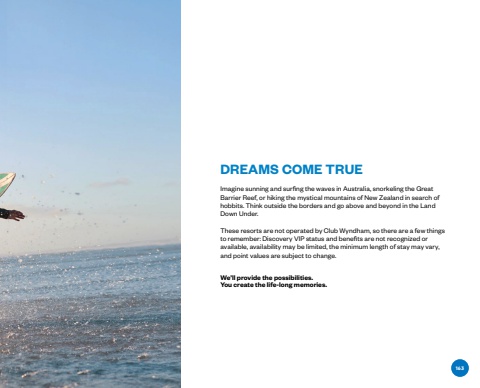 DREAMS COME TRUEImagine sunning and surfing the waves in Australia, snorkeling the Great Barrier Reef, or hiking the mystical mountains of New Zealand in search of hobbits. Think outside the borders and go above and beyond in the Land Down Under.These resorts are not operated by Club Wyndham, so there are a few things to remember: Discovery VIP status and benefits are not recognized or available, availability may be limited, the minimum length of stay may vary, and point values are subject to change.We%u2019ll provide the possibilities.You create the life-long memories.163