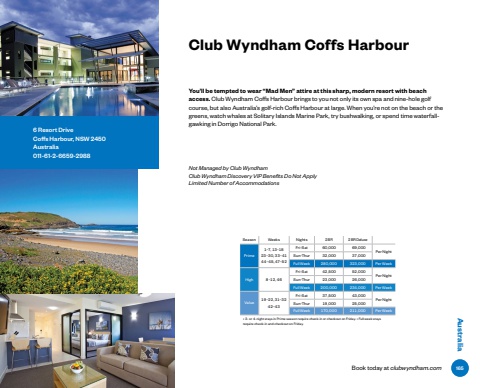 Resort Name Club Wyndham Coffs HarbourYou%u2019ll be tempted to wear %u201cMad Men%u201d attire at this sharp, modern resort with beach access. Club Wyndham Coffs Harbour brings to you not only its own spa and nine-hole golf course, but also Australia%u2019s golf-rich Coffs Harbour at large. When you%u2019re not on the beach or the greens, watch whales at Solitary Islands Marine Park, try bushwalking, or spend time waterfallgawking in Dorrigo National Park. Not Managed by Club WyndhamClub Wyndham Discovery VIP Benefits Do Not ApplyLimited Number of AccommodationsSeason Weeks Nights 2 BR 2 BR DeluxePrime1%u20137, 13%u201318 23%u201330, 33%u20134144%u201345, 47%u201352Fri-Sat 60%ufffd000 69%ufffd000Per NightSun-Thur 32%ufffd000 37%ufffd000Full Week 280%ufffd000 323%ufffd000 Per WeekHigh 8%u201312, 46Fri-Sat 42%ufffd500 52%ufffd000Per NightSun-Thur 23%ufffd000 26%ufffd000Full Week 200%ufffd000 234%ufffd000 Per WeekValue 19%u201322, 31%u20133242%u201343Fri-Sat 37%ufffd500 43%ufffd000Per NightSun-Thur 19%ufffd000 25%ufffd000Full Week 170%ufffd000 211%ufffd000 Per Week%u2022 3- or 4-night stays in Prime season require check-in or checkout on Friday. %u2022 Full week stays require check-in and checkout on Friday.6 Resort DriveCoffs Harbour, NSW 2450Australia011-61-2-6659-2988Book today at clubwyndham.comAustralia165
