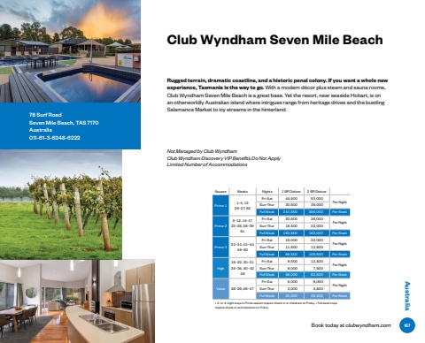 Club Wyndham Seven Mile BeachRugged terrain, dramatic coastline, and a historic penal colony. If you want a whole new experience, Tasmania is the way to go. With a modern d%u00e9cor plus steam and sauna rooms, Club Wyndham Seven Mile Beach is a great base. Yet the resort, near seaside Hobart, is on an otherworldly Australian island where intrigues range from heritage drives and the bustling Salamanca Market to icy streams in the hinterland.Not Managed by Club WyndhamClub Wyndham Discovery VIP Benefits Do Not ApplyLimited Number of AccommodationsSeason Weeks Nights 1 BR Deluxe 2 BR DeluxePrime 1 1%u20134, 1326%u201327, 52Fri-Sat 44%ufffd500 53%ufffd000Per NightSun-Thur 30%ufffd500 36%ufffd000Full Week 241%ufffd500 286%ufffd000 Per WeekPrime 25%u201312, 14%u20131723%u201325, 38%u20133951Fri-Sat 30%ufffd500 36%ufffd000Per NightSun-Thur 18%ufffd500 22%ufffd000Full Week 153%ufffd500 182%ufffd000 Per WeekPrime 3 32%u201334, 43%u20134448%u201350Fri-Sat 19%ufffd000 22%ufffd000Per NightSun-Thur 11%ufffd500 12%ufffd500Full Week 95%ufffd500 106%ufffd500 Per WeekHigh18%u201322, 30%u20133135%u201335, 40%u20134245Fri-Sat 9%ufffd500 12%ufffd500Per NightSun-Thur 6%ufffd000 7%ufffd500Full Week 49%ufffd000 62%ufffd500 Per WeekValue 28%u201329, 46%u201347Fri-Sat 5%ufffd000 8%ufffd000Per NightSun-Thur 3%ufffd000 4%ufffd500Full Week 25%ufffd000 38%ufffd500 Per Week%u2022 3- or 4-night stays in Prime season require check-in or checkout on Friday. %u2022 Full week stays require check-in and checkout on Friday.78 Surf Road Seven Mile Beach, TAS 7170 Australia011-61-3-6248-6222Book today at clubwyndham.comAustralia167