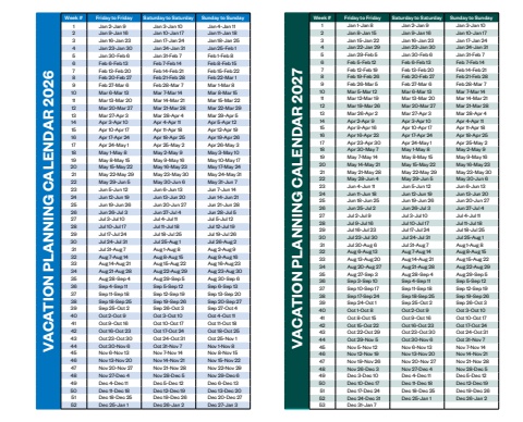 VACATION PLANNING CALENDAR 2026Week # Friday to Friday Saturday to Saturday Sunday to Sunday1 Jan 2-Jan 9 Jan 3-Jan 10 Jan 4-Jan 112 Jan 9-Jan 16 Jan 10-Jan 17 Jan 11-Jan 183 Jan 16-Jan 23 Jan 17-Jan 24 Jan 18-Jan 254 Jan 23-Jan 30 Jan 24-Jan 31 Jan 25-Feb 15 Jan 30-Feb 6 Jan 31-Feb 7 Feb 1-Feb 86 Feb 6-Feb 13 Feb 7-Feb 14 Feb 8-Feb 157 Feb 13-Feb 20 Feb 14-Feb 21 Feb 15-Feb 228 Feb 20-Feb 27 Feb 21-Feb 28 Feb 22-Mar 19 Feb 27-Mar 6 Feb 28-Mar 7 Mar 1-Mar 810 Mar 6-Mar 13 Mar 7-Mar 14 Mar 8-Mar 1511 Mar 13-Mar 20 Mar 14-Mar 21 Mar 15-Mar 2212 Mar 20-Mar 27 Mar 21-Mar 28 Mar 22-Mar 2913 Mar 27-Apr 3 Mar 28-Apr 4 Mar 29-Apr 514 Apr 3-Apr 10 Apr 4-Apr 11 Apr 5-Apr 1215 Apr 10-Apr 17 Apr 11-Apr 18 Apr 12-Apr 1916 Apr 17-Apr 24 Apr 18-Apr 25 Apr 19-Apr 2617 Apr 24-May 1 Apr 25-May 2 Apr 26-May 318 May 1-May 8 May 2-May 9 May 3-May 1019 May 8-May 15 May 9-May 16 May 10-May 1720 May 15-May 22 May 16-May 23 May 17-May 2421 May 22-May 29 May 23-May 30 May 24-May 3122 May 29-Jun 5 May 30-Jun 6 May 31-Jun 723 Jun 5-Jun 12 Jun 6-Jun 13 Jun 7-Jun 1424 Jun 12-Jun 19 Jun 13-Jun 20 Jun 14-Jun 2125 Jun 19-Jun 26 Jun 20-Jun 27 Jun 21-Jun 2826 Jun 26-Jul 3 Jun 27-Jul 4 Jun 28-Jul 527 Jul 3-Jul 10 Jul 4-Jul 11 Jul 5-Jul 1228 Jul 10-Jul 17 Jul 11-Jul 18 Jul 12-Jul 1929 Jul 17-Jul 24 Jul 18-Jul 25 Jul 19-Jul 2630 Jul 24-Jul 31 Jul 25-Aug 1 Jul 26-Aug 231 Jul 31-Aug 7 Aug 1-Aug 8 Aug 2-Aug 932 Aug 7-Aug 14 Aug 8-Aug 15 Aug 9-Aug 1633 Aug 14-Aug 21 Aug 15-Aug 22 Aug 16-Aug 2334 Aug 21-Aug 28 Aug 22-Aug 29 Aug 23-Aug 3035 Aug 28-Sep 4 Aug 29-Sep 5 Aug 30-Sep 636 Sep 4-Sep 11 Sep 5-Sep 12 Sep 6-Sep 1337 Sep 11-Sep 18 Sep 12-Sep 19 Sep 13-Sep 2038 Sep 18-Sep 25 Sep 19-Sep 26 Sep 20-Sep 2739 Sep 25-Oct 2 Sep 26-Oct 3 Sep 27-Oct 440 Oct 2-Oct 9 Oct 3-Oct 10 Oct 4-Oct 1141 Oct 9-Oct 16 Oct 10-Oct 17 Oct 11-Oct 1842 Oct 16-Oct 23 Oct 17-Oct 24 Oct 18-Oct 2543 Oct 23-Oct 30 Oct 24-Oct 31 Oct 25-Nov 144 Oct 30-Nov 6 Oct 31-Nov 7 Nov 1-Nov 845 Nov 6-Nov 13 Nov 7-Nov 14 Nov 8-Nov 1546 Nov 13-Nov 20 Nov 14-Nov 21 Nov 15-Nov 2247 Nov 20-Nov 27 Nov 21-Nov 28 Nov 22-Nov 2948 Nov 27-Dec 4 Nov 28-Dec 5 Nov 29-Dec 649 Dec 4-Dec 11 Dec 5-Dec 12 Dec 6-Dec 1350 Dec 11-Dec 18 Dec 12-Dec 19 Dec 13-Dec 2051 Dec 18-Dec 25 Dec 19-Dec 26 Dec 20-Dec 2752 Dec 25-Jan 1 Dec 26-Jan 2 Dec 27-Jan 3VACATION PLANNING CALENDAR 2027Week # Friday to Friday Saturday to Saturday Sunday to Sunday1 Jan 1-Jan 8 Jan 2-Jan 9 Jan 3-Jan 102 Jan 8-Jan 15 Jan 9-Jan 16 Jan 10-Jan 173 Jan 15-Jan 22 Jan 16-Jan 23 Jan 17-Jan 244 Jan 22-Jan 29 Jan 23-Jan 30 Jan 24-Jan 315 Jan 29-Feb 5 Jan 30-Feb 6 Jan 31-Feb 76 Feb 5-Feb 12 Feb 6-Feb 13 Feb 7-Feb 147 Feb 12-Feb 19 Feb 13-Feb 20 Feb 14-Feb 218 Feb 19-Feb 26 Feb 20-Feb 27 Feb 21-Feb 289 Feb 26-Mar 5 Feb 27-Mar 6 Feb 28-Mar 710 Mar 5-Mar 12 Mar 6-Mar 13 Mar 7-Mar 1411 Mar 12-Mar 19 Mar 13-Mar 20 Mar 14-Mar 2112 Mar 19-Mar 26 Mar 20-Mar 27 Mar 21-Mar 2813 Mar 26-Apr 2 Mar 27-Apr 3 Mar 28-Apr 414 Apr 2-Apr 9 Apr 3-Apr 10 Apr 4-Apr 1115 Apr 9-Apr 16 Apr 10-Apr 17 Apr 11-Apr 1816 Apr 16-Apr 23 Apr 17-Apr 24 Apr 18-Apr 2517 Apr 23-Apr 30 Apr 24-May 1 Apr 25-May 218 Apr 30-May 7 May 1-May 8 May 2-May 919 May 7-May 14 May 8-May 15 May 9-May 1620 May 14-May 21 May 15-May 22 May 16-May 2321 May 21-May 28 May 22-May 29 May 23-May 3022 May 28-Jun 4 May 29-Jun 5 May 30-Jun 623 Jun 4-Jun 11 Jun 5-Jun 12 Jun 6-Jun 1324 Jun 11-Jun 18 Jun 12-Jun 19 Jun 13-Jun 2025 Jun 18-Jun 25 Jun 19-Jun 26 Jun 20-Jun 2726 Jun 25-Jul 2 Jun 26-Jul 3 Jun 27-Jul 427 Jul 2-Jul 9 Jul 3-Jul 10 Jul 4-Jul 1128 Jul 9-Jul 16 Jul 10-Jul 17 Jul 11-Jul 1829 Jul 16-Jul 23 Jul 17-Jul 24 Jul 18-Jul 2530 Jul 23-Jul 30 Jul 24-Jul 31 Jul 25-Aug 131 Jul 30-Aug 6 Jul 31-Aug 7 Aug 1-Aug 832 Aug 6-Aug 13 Aug 7-Aug 14 Aug 8-Aug 1533 Aug 13-Aug 20 Aug 14-Aug 21 Aug 15-Aug 2234 Aug 20-Aug 27 Aug 21-Aug 28 Aug 22-Aug 2935 Aug 27-Sep 3 Aug 28-Sep 4 Aug 29-Sep 536 Sep 3-Sep 10 Sep 4-Sep 11 Sep 5-Sep 1237 Sep 10-Sep 17 Sep 11-Sep 18 Sep 12-Sep 1938 Sep 17-Sep 24 Sep 18-Sep 25 Sep 19-Sep 2639 Sep 24-Oct 1 Sep 25-Oct 2 Sep 26-Oct 340 Oct 1-Oct 8 Oct 2-Oct 9 Oct 3-Oct 1041 Oct 8-Oct 15 Oct 9-Oct 16 Oct 10-Oct 1742 Oct 15-Oct 22 Oct 16-Oct 23 Oct 17-Oct 2443 Oct 22-Oct 29 Oct 23-Oct 30 Oct 24-Oct 3144 Oct 29-Nov 5 Oct 30-Nov 6 Oct 31-Nov 745 Nov 5-Nov 12 Nov 6-Nov 13 Nov 7-Nov 1446 Nov 12-Nov 19 Nov 13-Nov 20 Nov 14-Nov 2147 Nov 19-Nov 26 Nov 20-Nov 27 Nov 21-Nov 2848 Nov 26-Dec 3 Nov 27-Dec 4 Nov 28-Dec 549 Dec 3-Dec 10 Dec 4-Dec 11 Dec 5-Dec 1250 Dec 10-Dec 17 Dec 11-Dec 18 Dec 12-Dec 1951 Dec 17-Dec 24 Dec 18-Dec 25 Dec 19-Dec 2652 Dec 24-Dec 31 Dec 25-Jan 1 Dec 26-Jan 253 Dec 31-Jan 7