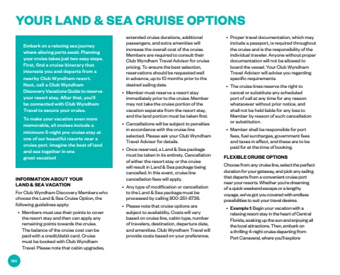 INFORMATION ABOUT YOUR LAND & SEA VACATIONFor Club Wyndham Discovery Members who choose the Land & Sea Cruise Option, the following guidelines apply:%u2022 Members must use their points to cover the resort stay and then can apply any remaining points towards the cruise. The balance of the cruise cost can be paid with a credit/debit card. Cruise must be booked with Club Wyndham Travel. Please note that cabin upgrades, extended cruise durations, additional passengers, and extra amenities will increase the overall cost of the cruise. Members are required to consult their Club Wyndham Travel Advisor for cruise pricing. To ensure the best selection, reservations should be requested well in advance, up to 10 months prior to the desired sailing date.%u2022 Member must reserve a resort stay immediately prior to the cruise. Member may not take the cruise portion of the vacation separate from the resort stay, and the land portion must be taken first.%u2022 Cancellations will be subject to penalties in accordance with the cruise line selected. Please ask your Club Wyndham Travel Advisor for details.%u2022 Once reserved, a Land & Sea package must be taken in its entirety. Cancellation of either the resort stay or the cruise will result in Land & Sea package being cancelled. In this event, cruise line cancellation fees will apply.%u2022 Any type of modification or cancellation to the Land & Sea package must be processed by calling 800-251-8736.%u2022 Please note that cruise options are subject to availability. Costs will vary based on cruise line, cabin type, number of travelers, destination, departure date, and amenities. Club Wyndham Travel will provide costs based on your preference.%u2022 Proper travel documentation, which may include a passport, is required throughout the cruise and is the responsibility of the individual traveler. Anyone without proper documentation will not be allowed to board the vessel. Your Club Wyndham Travel Advisor will advise you regarding specific requirements.%u2022 The cruise lines reserve the right to cancel or substitute any scheduled port of call at any time for any reason whatsoever without prior notice, and shall not be held liable for any loss to Member by reason of such cancellation or substitution. %u2022 Member shall be responsible for port fees, fuel surcharges, government fees and taxes in effect, and these are to be paid for at the time of booking.FLEXIBLE CRUISE OPTIONSChoose from any cruise line, select the perfect duration for your getaway, and pick any sailing that departs from a convenient cruise port near your resorts. Whether you%u2019re dreaming of a quick weekend escape or a lengthy voyage, we%u2019ve got you covered with endless possibilities to suit your travel desires.%u2022 Example 1: Begin your vacation with a relaxing resort stay in the heart of Central Florida, soaking up the sun and enjoying all the local attractions. Then, embark on a thrilling 4-night cruise departing from Port Canaveral, where you%u2019ll explore YOUR LAND & SEA CRUISE OPTIONSEmbark on a relaxing sea journey where alluring ports await. Planning your cruise takes just two easy steps. First, find a cruise itinerary that interests you and departs from a nearby Club Wyndham resort. Next, call a Club Wyndham Discovery Vacations Guide to reserve your resort stay. After that, you%u2019ll be connected with Club Wyndham Travel to secure your cruise.To make your vacation even more memorable, all cruises include a minimum 3-night pre-cruise stay at one of our beautiful resorts near a cruise port. Imagine the best of land and sea together in one great vacation! 180