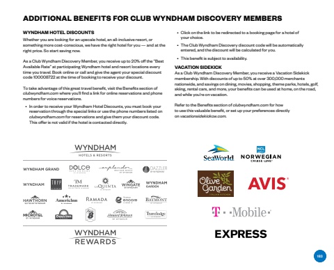 WYNDHAM HOTEL DISCOUNTSWhether you are looking for an upscale hotel, an all-inclusive resort, or something more cost-conscious, we have the right hotel for you %u2014 and at the right price. So start saving now.As a Club Wyndham Discovery Member, you receive up to 20% off the %u201cBest Available Rate%u201d at participating Wyndham hotel and resort locations every time you travel. Book online or call and give the agent your special discount code 100008722 at the time of booking to receive your discount.To take advantage of this great travel benefit, visit the Benefits section of clubwyndham.com where you%u2019ll find a link for online reservations and phone numbers for voice reservations.%u2022 In order to receive your Wyndham Hotel Discounts, you must book your reservation through the special links or use the phone numbers listed on clubwyndham.com for reservations and give them your discount code. This offer is not valid if the hotel is contacted directly.%u2022 Click on the link to be redirected to a booking page for a hotel of your choice.%u2022 The Club Wyndham Discovery discount code will be automatically entered, and the discount will be calculated for you.%u2022 This benefit is subject to availability.VACATION SIDEKICKAs a Club Wyndham Discovery Member, you receive a Vacation Sidekick membership. With discounts of up to 50% at over 300,000 merchants nationwide, and savings on dining, movies, shopping, theme parks, hotels, golf, skiing, rental cars, and more, your benefits can be used at home, on the road, and while you%u2019re on vacation. Refer to the Benefits section of clubwyndham.com for how to use this valuable benefit, or set up your preferences directly on vacationsidekickcw.com.ADDITIONAL BENEFITS FOR CLUB WYNDHAM DISCOVERY MEMBERS183