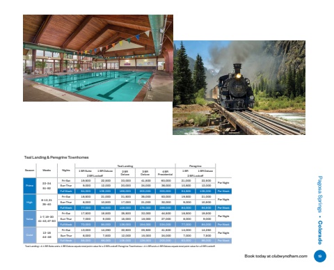 Book today at clubwyndham.comPagosa Springs %u2022 ColoradoTeal Landing & Peregrine TownhomesSeason Weeks NightsTeal Landing Peregrine1 BR Suite 1 BR Deluxe 2 BRDeluxe3 BRDeluxe4 BR Presidential1 BR 1 BR Deluxe2 BR Lockoff 2 BR Lockoff Prime 22%u20133451%u201352Fri-Sat 19%ufffd500 22%ufffd500 33%ufffd000 41%ufffd500 60%ufffd000 21%ufffd000 22%ufffd500Per NightSun-Thur 9%ufffd000 12%ufffd000 20%ufffd000 24%ufffd000 36%ufffd000 10%ufffd500 12%ufffd000Full Week 84%ufffd000 105%ufffd000 166%ufffd000 203%ufffd000 300%ufffd000 94%ufffd500 105%ufffd000 Per WeekHigh 8%u201312, 2135%u201340Fri-Sat 18%ufffd500 21%ufffd000 31%ufffd500 35%ufffd000 53%ufffd000 19%ufffd500 21%ufffd000Per NightSun-Thur 8%ufffd000 10%ufffd500 17%ufffd000 21%ufffd000 32%ufffd000 9%ufffd000 10%ufffd500Full Week 77%ufffd000 94%ufffd500 148%ufffd000 175%ufffd000 266%ufffd000 84%ufffd000 94%ufffd500 Per WeekValue 1%u20137, 19%u20132041%u201343, 47%u201350Fri-Sat 17%ufffd500 19%ufffd500 25%ufffd500 32%ufffd000 44%ufffd500 18%ufffd500 19%ufffd500Per NightSun-Thur 7%ufffd000 9%ufffd000 15%ufffd000 18%ufffd000 27%ufffd000 8%ufffd000 9%ufffd000Full Week 70%ufffd000 84%ufffd000 126%ufffd000 154%ufffd000 224%ufffd000 77%ufffd000 84%ufffd000 Per WeekQuiet13%u20131844%u201346Fri-Sat 13%ufffd000 14%ufffd250 22%ufffd500 25%ufffd500 41%ufffd500 14%ufffd000 14%ufffd250Per NightSun-Thur 6%ufffd000 7%ufffd500 12%ufffd000 15%ufffd000 24%ufffd000 7%ufffd000 7%ufffd500Full Week 56%ufffd000 66%ufffd000 105%ufffd000 126%ufffd000 203%ufffd000 63%ufffd000 66%ufffd000 Per WeekTeal Landing: %u2022 A 1 BR Suite and a 1 BR Deluxe equals total point value for a 2 BR Lockoff . Peregrine Townhomes: %u2022 A 1 BR and a 1 BR Deluxe equals total point value for a 2 BR Lockoff .19