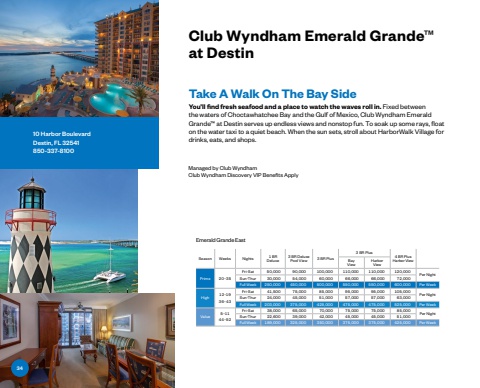 Managed by Club WyndhamClub Wyndham Discovery VIP Benefits ApplyClub Wyndham Emerald Grande%u2122at DestinTake A Walk On The Bay SideYou%u2019ll find fresh seafood and a place to watch the waves roll in. Fixed between the waters of Choctawhatchee Bay and the Gulf of Mexico, Club Wyndham Emerald Grande%u2122 at Destin serves up endless views and nonstop fun. To soak up some rays, float on the water taxi to a quiet beach. When the sun sets, stroll about HarborWalk Village for drinks, eats, and shops.10 Harbor BoulevardDestin, FL 32541850-337-8100Emerald Grande EastSeason Weeks Nights 1 BRDeluxe3 BR Deluxe Pool View 3 BR Plus3 BR Plus 4 BR Plus Bay Harbor View ViewHarbor ViewPrime 20%u201335Fri-Sat 50%ufffd000 90%ufffd000 100%ufffd000 110%ufffd000 110%ufffd000 120%ufffd000Per Night Sun-Thur 30%ufffd000 54%ufffd000 60%ufffd000 66%ufffd000 66%ufffd000 72%ufffd000Full Week 250%ufffd000 450%ufffd000 500%ufffd000 550%ufffd000 550%ufffd000 600%ufffd000 Per WeekHigh12%u20131936%u201343Fri-Sat 41%ufffd500 75%ufffd000 85%ufffd000 95%ufffd000 95%ufffd000 105%ufffd000Per Night Sun-Thur 24%ufffd000 45%ufffd000 51%ufffd000 57%ufffd000 57%ufffd000 63%ufffd000Full Week 203%ufffd000 375%ufffd000 425%ufffd000 475%ufffd000 475%ufffd000 525%ufffd000 Per WeekValue 5%u20131144%u201352Fri-Sat 38%ufffd000 65%ufffd000 70%ufffd000 75%ufffd000 75%ufffd000 85%ufffd000 Per Night Sun-Thur 22%ufffd600 39%ufffd000 42%ufffd000 45%ufffd000 45%ufffd000 51%ufffd000Full Week 189%ufffd000 325%ufffd000 350%ufffd000 375%ufffd000 375%ufffd000 425%ufffd000 Per Week34