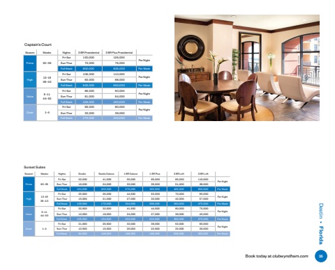 Book today at clubwyndham.comDestin %u2022 FloridaCaptain%u2019s CourtSeason Weeks Nights 3 BR Presidential 3 BR Plus PresidentialPrime 20%u201335Fri-Sat 120%ufffd000 125%ufffd000Per NightSun-Thur 72%ufffd000 75%ufffd000Full Week 600%ufffd000 625%ufffd000 Per WeekHigh12%u20131936%u201343Fri-Sat 105%ufffd000 110%ufffd000Per NightSun-Thur 63%ufffd000 66%ufffd000Full Week 525%ufffd000 550%ufffd000 Per WeekValue 5%u20131144%u201352Fri-Sat 85%ufffd000 90%ufffd000Per NightSun-Thur 51%ufffd000 54%ufffd000Full Week 425%ufffd000 450%ufffd000 Per WeekQuiet 1%u20134Fri-Sat 55%ufffd000 60%ufffd000Per NightSun-Thur 33%ufffd000 36%ufffd000Full Week 275%ufffd000 300%ufffd000 Per WeekSunset SuitesSeason Weeks Nights Studio Studio Deluxe 1 BR Deluxe 1 BR Plus 2 BR Loft 3 BR LoftPrime 20%u201335Fri-Sat 32%ufffd000 41%ufffd500 55%ufffd000 65%ufffd000 85%ufffd000 110%ufffd000Per Night Sun-Thur 18%ufffd000 24%ufffd000 33%ufffd000 39%ufffd000 51%ufffd000 66%ufffd000Full Week 154%ufffd000 203%ufffd000 275%ufffd000 325%ufffd000 425%ufffd000 550%ufffd000 Per WeekHigh 12%u20131936%u201343Fri-Sat 25%ufffd500 35%ufffd000 44%ufffd500 53%ufffd000 70%ufffd000 95%ufffd000Per Night Sun-Thur 15%ufffd000 21%ufffd000 27%ufffd000 32%ufffd000 42%ufffd000 57%ufffd000Full Week 126%ufffd000 175%ufffd000 224%ufffd000 266%ufffd000 350%ufffd000 475%ufffd000 Per WeekValue 5%u20131144%u201353Fri-Sat 22%ufffd500 32%ufffd000 41%ufffd500 44%ufffd500 60%ufffd000 75%ufffd000Per Night Sun-Thur 12%ufffd000 18%ufffd000 24%ufffd000 27%ufffd000 36%ufffd000 45%ufffd000Full Week 105%ufffd000 154%ufffd000 203%ufffd000 224%ufffd000 300%ufffd000 375%ufffd000 Per WeekQuiet 1%u20134Fri-Sat 21%ufffd000 25%ufffd500 33%ufffd000 38%ufffd000 53%ufffd000 60%ufffd000Per Night Sun-Thur 10%ufffd500 15%ufffd000 20%ufffd000 22%ufffd600 32%ufffd000 36%ufffd000Full Week 94%ufffd500 126%ufffd000 166%ufffd000 189%ufffd000 266%ufffd000 300%ufffd000 Per Week35