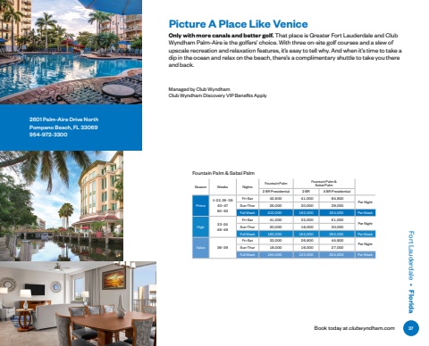 Book today at clubwyndham.comFort Lauderdale %u2022 Florida2601 Palm-Aire Drive NorthPompano Beach, FL 33069954-972-3300Picture A Place Like VeniceManaged by Club WyndhamClub Wyndham Discovery VIP Benefits ApplyFountain Palm & Sabal PalmSeason Weeks Nights Fountain Palm Fountain Palm &Sabal Palm2 BR Presidential 2 BR 4 BR PresidentialPrime1%u201322, 25%u20133540%u20134750%u201352Fri-Sat 42%ufffd500 41%ufffd000 64%ufffd500Per NightSun-Thur 25%ufffd000 20%ufffd000 39%ufffd000Full Week 210%ufffd000 182%ufffd000 324%ufffd000 Per WeekHigh23%u20132448%u201349Fri-Sat 41%ufffd000 32%ufffd000 51%ufffd000Per NightSun-Thur 20%ufffd000 18%ufffd000 30%ufffd000Full Week 182%ufffd000 154%ufffd000 252%ufffd000 Per WeekValue 36%u201339Fri-Sat 32%ufffd000 26%ufffd500 44%ufffd500Per NightSun-Thur 18%ufffd000 16%ufffd000 27%ufffd000Full Week 154%ufffd000 133%ufffd000 224%ufffd000 Per WeekOnly with more canals and better golf. That place is Greater Fort Lauderdale and Club Wyndham Palm-Aire is the golfers%u2019 choice. With three on-site golf courses and a slew of upscale recreation and relaxation features, it%u2019s easy to tell why. And when it%u2019s time to take a dip in the ocean and relax on the beach, there%u2019s a complimentary shuttle to take you there and back.37