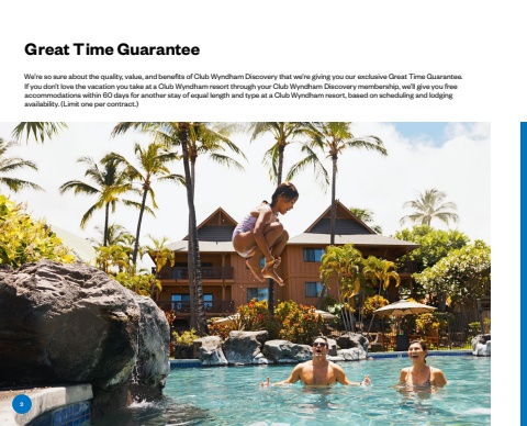 Great Time Guarantee We%u2019re so sure about the quality, value, and benefits of Club Wyndham Discovery that we%u2019re giving you our exclusive Great Time Guarantee.If you don%u2019t love the vacation you take at a Club Wyndham resort through your Club Wyndham Discovery membership, we%u2019ll give you free accommodations within 60 days for another stay of equal length and type at a Club Wyndham resort, based on scheduling and lodging availability. (Limit one per contract.)2