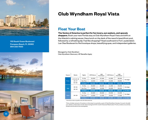Managed by Club WyndhamClub Wyndham Discovery VIP Benefits ApplyClub Wyndham Royal Vista Float Your Boat The Venice of America is perfect for fun lovers, sun seekers, and upscale shoppers. Book your next Florida stay at Club Wyndham Royal Vista and drift on the Atlantic%u2019s calming waves. Have lunch on the deck of the resort%u2019s beachfront pool, followed by a refreshing dip. Feel like shopping? Head southward to Fort Lauderdale%u2019s Las Olas Boulevard to find boutique shops, beautifying spas, and independent galleries. 1110 South Ocean BoulevardPompano Beach, FL 33062954-233-7500Season Weeks Nights 1 BR Deluxe 1 BRPoint Saver 2 BR Deluxe 2 BRPoint SaverPrime1%u201322, 25%u20133540%u20134750%u201352Fri-Sat 32%ufffd000 27%ufffd500 41%ufffd500 38%ufffd000Per NightSun-Thur 18%ufffd000 17%ufffd000 24%ufffd000 22%ufffd600Full Week 154%ufffd000 140%ufffd000 203%ufffd000 189%ufffd000 Per WeekHigh23%u20132448%u201349Fri-Sat 25%ufffd500 25%ufffd000 41%ufffd000 33%ufffd000Per NightSun-Thur 15%ufffd000 13%ufffd000 20%ufffd000 20%ufffd000Full Week 126%ufffd000 115%ufffd000 182%ufffd000 166%ufffd000 Per WeekValue 36%u201339Fri-Sat 22%ufffd500 20%ufffd500 33%ufffd000 31%ufffd500Per NightSun-Thur 12%ufffd000 11%ufffd000 19%ufffd000 17%ufffd000Full Week 105%ufffd000 96%ufffd000 161%ufffd000 148%ufffd000 Per Week%u2022 Point Saver refers to specifi c units with obstructed view.*Only a limited amount of inventory in this resort is currently a part of Club Wyndham Access. As such, the ability to obtain a reservation at this resort during the 13-10 month Advance Reservation Priority window is currently limited and should not be anticipated.40