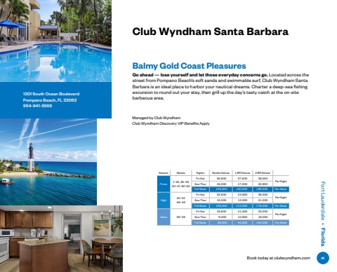 Book today at clubwyndham.comFort Lauderdale %u2022 FloridaClub Wyndham Santa Barbara Balmy Gold Coast Pleasures Go ahead %u2014 lose yourself and let those everyday concerns go. Located across the street from Pompano Beach%u2019s soft sands and swimmable surf, Club Wyndham Santa Barbara is an ideal place to harbor your nautical dreams. Charter a deep-sea fishing excursion to round out your stay, then grill up the day%u2019s tasty catch at the on-site barbecue area.Managed by Club WyndhamClub Wyndham Discovery VIP Benefits Apply1301 South Ocean BoulevardPompano Beach, FL 33062954-941-5566Season Weeks Nights Studio Deluxe 1 BR Deluxe 2 BR DeluxePrime 1%u201322, 25%u20133540%u201347, 50%u201352Fri-Sat 25%ufffd500 27%ufffd500 38%ufffd000Per NightSun-Thur 15%ufffd000 17%ufffd000 22%ufffd600Full Week 126%ufffd000 140%ufffd000 189%ufffd000 Per WeekHigh23%u20132448%u201349Fri-Sat 22%ufffd500 23%ufffd500 35%ufffd000Per NightSun-Thur 12%ufffd000 13%ufffd000 21%ufffd000Full Week 105%ufffd000 112%ufffd000 175%ufffd000 Per WeekValue 36%u201339Fri-Sat 19%ufffd500 21%ufffd000 32%ufffd000Per NightSun-Thur 9%ufffd000 10%ufffd500 18%ufffd000Full Week 84%ufffd000 94%ufffd500 154%ufffd000 Per Week41
