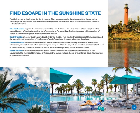 Book today at clubwyndham.comFIND ESCAPE IN THE SUNSHINE STATEFlorida is your top destination for fun in the sun. Discover spectacular beaches, exciting theme parks, and always-on city action. And no matter where you are, you%u2019re never more than 60 miles from Florida%u2019s saltwater shoreline. The Panhandle: Dig into the Emerald Coast in the Florida Panhandle. This stretch of sand captures the natural beauty of the Gulf coastline from Pensacola to Panama City. Explore the sugar-white beaches of Destin or the emerald-green waters of Miramar Beach. North Florida: Uncover the treasured past of North Florida. From the First Coast cities of St. Augustine and Jacksonville to the nostalgia of the Daytona Beach Speedway, timeless adventure lives here. Central Florida: Experience the thrills of Central Florida. From award-winning beaches to world-class attractions, Central Florida offers something for everyone. Visit the crystal-clear waters of Clearwater Beach or the exhilarating theme parks of Orlando for a sun-soaked getaway that is second to none. South Florida: Catch the vibe in sunny South Florida. Discover the beachfront promenades of Fort Lauderdale, the metropolitan mecca of Miami, or the calming island shores of the Florida Keys. Your journey to paradise starts here. 45
