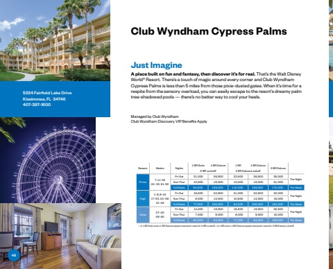 Managed by Club WyndhamClub Wyndham Discovery VIP Benefits ApplyClub Wyndham Cypress PalmsJust ImagineA place built on fun and fantasy, then discover it%u2019s for real. That%u2019s the Walt Disney World%u00ae Resort. There%u2019s a touch of magic around every corner and Club Wyndham Cypress Palms is less than 5 miles from those pixie-dusted gates. When it%u2019s time for a respite from the sensory overload, you can easily escape to the resort%u2019s dreamy palm tree-shadowed pools %u2014 there%u2019s no better way to cool your heels.5324 Fairfield Lake DriveKissimmee, FL 34746407-397-1600Season Weeks Nights1 BR Suite 1 BR Deluxe 1 BR 1 BR Deluxe2 BR Deluxe2 BR Lockoff 2 BR Deluxe Lockoff Prime 7, 11%u20131624%u201333, 51%u201352Fri-Sat 21%ufffd000 26%ufffd500 23%ufffd500 26%ufffd500 35%ufffd000Per NightSun-Thur 10%ufffd500 15%ufffd000 13%ufffd000 15%ufffd000 21%ufffd000Full Week 94%ufffd500 128%ufffd000 112%ufffd000 128%ufffd000 175%ufffd000 Per WeekHigh1%u20136, 8%u20131017%u201323, 34%u20133641%u201348Fri-Sat 18%ufffd500 22%ufffd500 21%ufffd000 22%ufffd500 32%ufffd000Per NightSun-Thur 8%ufffd000 12%ufffd000 10%ufffd500 12%ufffd000 18%ufffd000Full Week 77%ufffd000 105%ufffd000 94%ufffd500 105%ufffd000 154%ufffd000 Per WeekValue 37%u20134049%u201350Fri-Sat 14%ufffd000 19%ufffd500 18%ufffd500 19%ufffd500 25%ufffd500Per NightSun-Thur 7%ufffd000 9%ufffd000 8%ufffd000 9%ufffd000 15%ufffd000Full Week 63%ufffd000 84%ufffd000 77%ufffd000 84%ufffd000 126%ufffd000 Per Week%u2022 A 1 BR Suite and a 1 BR Deluxe equals total point value for 2 BR Lockoff . %u2022 A 1 BR and a 1 BR Deluxe equals total point value for 2 BR Deluxe Lockoff .48