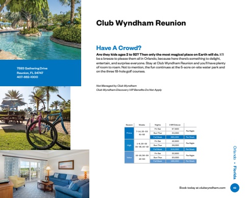 Book today at clubwyndham.comOrlando %u2022 FloridaClub Wyndham ReunionHave A Crowd? Are they kids ages 2 to 92? Then only the most magical place on Earth will do. It%u2019ll be a breeze to please them all in Orlando, because here there%u2019s something to delight, entertain, and surprise everyone. Stay at Club Wyndham Reunion and you%u2019ll have plenty of room to roam. Not to mention, the fun continues at the 5-acre on-site water park and on the three 18-hole golf courses.Not Managed by Club WyndhamClub Wyndham Discovery VIP Benefits Do Not Apply7593 Gathering DriveReunion, FL 34747407-662-1000Season Weeks Nights 3 BR DeluxePrime 7%u201314, 23%u20133351%u201352Fri-Sat 57%ufffd500Per NightSun-Thur 34%ufffd000Full Week 285%ufffd000 Per WeekHigh 1%u20136, 20%u20132234%u201335, 40%u201342Fri-Sat 42%ufffd500Per NightSun-Thur 26%ufffd000Full Week 215%ufffd000 Per WeekValue 15%u201319, 36%u20133943%u201350Fri-Sat 32%ufffd500Per NightSun-Thur 20%ufffd000Full Week 165%ufffd000 Per Week49