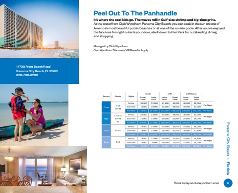 Book today at clubwyndham.comPanama City Beach %u2022 FloridaManaged by Club WyndhamClub Wyndham Discovery VIP Benefits Apply14700 Front Beach RoadPanama City Beach, FL 32413850-636-8200Peel Out To The PanhandleSeason Weeks NightsStudio 1 BR 1 BR DeluxeLower LevelUpperLevelLowerLevelUpperLevelLowerLevelUpperLevelPrime 7%u20131318%u201339Fri-Sat 25%ufffd500 32%ufffd000 41%ufffd500 49%ufffd000 49%ufffd000 55%ufffd000 Per NightSun-Thur 15%ufffd000 18%ufffd000 24%ufffd000 28%ufffd000 28%ufffd000 33%ufffd000 Full Week 126%ufffd000 154%ufffd000 203%ufffd000 238%ufffd000 238%ufffd000 275%ufffd000 Per WeekHigh1, 14%u20131740%u20134652Fri-Sat 22%ufffd500 23%ufffd500 33%ufffd000 38%ufffd000 38%ufffd000 43%ufffd000Per NightSun-Thur 12%ufffd000 13%ufffd000 20%ufffd000 22%ufffd600 22%ufffd600 26%ufffd000Full Week 105%ufffd000 112%ufffd000 166%ufffd000 189%ufffd000 189%ufffd000 216%ufffd000 Per WeekValue 47%u201351Fri-Sat 19%ufffd500 22%ufffd500 32%ufffd000 33%ufffd000 33%ufffd000 38%ufffd000 Per NightSun-Thur 9%ufffd000 12%ufffd000 18%ufffd000 20%ufffd000 20%ufffd000 22%ufffd600 Full Week 84%ufffd000 105%ufffd000 154%ufffd000 166%ufffd000 166%ufffd000 189%ufffd000 Per WeekQuiet 2%u20136Fri-Sat 9%ufffd500 13%ufffd000 20%ufffd000 22%ufffd500 22%ufffd500 25%ufffd500 Per NightSun-Thur 6%ufffd000 6%ufffd000 10%ufffd000 12%ufffd000 12%ufffd000 15%ufffd000Full Week 49%ufffd000 56%ufffd000 90%ufffd000 105%ufffd000 105%ufffd000 126%ufffd000 Per WeekIt%u2019s where the cool kids go. The waves roll in Gulf-size shrimp and big-time grins.At the waterfront Club Wyndham Panama City Beach, you can soak in the sun on one of America%u2019s most beautiful public beaches or at one of the on-site pools. After you%u2019ve enjoyed the fabulous fun right outside your door, stroll down to Pier Park for outstanding dining and shopping. 51
