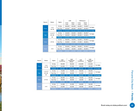 Book today at clubwyndham.comPanama City Beach %u2022 FloridaSeason Weeks Nights2 BR 2 BR DeluxeLowerLevelUpperLevelLowerLevelUpperLevelPrime 7%u20131318%u201339Fri-Sat 55%ufffd000 64%ufffd000 64%ufffd000 70%ufffd000Per NightSun-Thur 33%ufffd000 36%ufffd000 36%ufffd000 42%ufffd000Full Week 275%ufffd000 308%ufffd000 308%ufffd000 350%ufffd000 Per WeekHigh1, 14%u20131740%u20134652Fri-Sat 43%ufffd000 52%ufffd500 52%ufffd500 55%ufffd000 Per NightSun-Thur 26%ufffd000 29%ufffd000 29%ufffd000 33%ufffd000Full Week 216%ufffd000 250%ufffd000 250%ufffd000 275%ufffd000 Per WeekValue 47%u201351Fri-Sat 38%ufffd000 44%ufffd500 44%ufffd500 52%ufffd500Per NightSun-Thur 22%ufffd600 27%ufffd000 27%ufffd000 29%ufffd000 Full Week 189%ufffd000 224%ufffd000 224%ufffd000 250%ufffd000 Per WeekQuiet 2%u20136Fri-Sat 25%ufffd500 26%ufffd500 26%ufffd500 33%ufffd000Per NightSun-Thur 15%ufffd000 16%ufffd000 16%ufffd000 20%ufffd000Full Week 126%ufffd000 133%ufffd000 133%ufffd000 166%ufffd000 Per WeekSeason Weeks Nights 2 BR Presidential2 BR Presidential Deluxe3 BR Presidential3 BR Presidential DeluxePrime 7%u20131318%u201339Fri-Sat 90%ufffd000 95%ufffd000 110%ufffd000 115%ufffd000Per NightSun-Thur 54%ufffd000 57%ufffd000 66%ufffd000 69%ufffd000Full Week 450%ufffd000 475%ufffd000 550%ufffd000 575%ufffd000 Per WeekHigh1, 14%u20131740%u20134652Fri-Sat 70%ufffd000 75%ufffd000 85%ufffd000 90%ufffd000Per NightSun-Thur 42%ufffd000 45%ufffd000 51%ufffd000 54%ufffd000Full Week 350%ufffd000 375%ufffd000 425%ufffd000 450%ufffd000 Per WeekValue 47%u201351Fri-Sat 65%ufffd000 65%ufffd000 75%ufffd000 80%ufffd000Per NightSun-Thur 39%ufffd000 39%ufffd000 45%ufffd000 48%ufffd000Full Week 325%ufffd000 325%ufffd000 375%ufffd000 400%ufffd000 Per WeekQuiet 2%u20136Fri-Sat 41%ufffd500 41%ufffd500 52%ufffd500 53%ufffd000Per NightSun-Thur 24%ufffd000 24%ufffd000 29%ufffd000 32%ufffd000Full Week 203%ufffd000 203%ufffd000 250%ufffd000 266%ufffd000 Per Week53