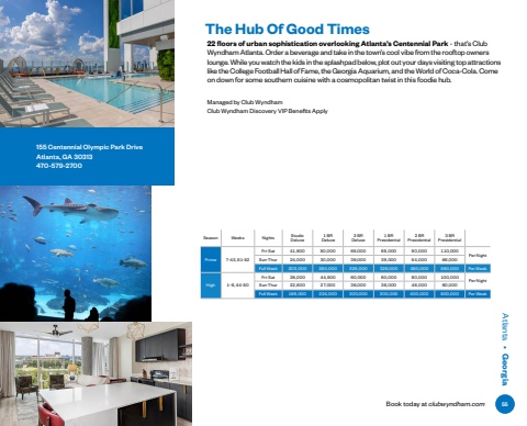 Book today at clubwyndham.comAtlanta %u2022 GeorgiaManaged by Club WyndhamClub Wyndham Discovery VIP Benefits Apply22 floors of urban sophistication overlooking Atlanta%u2019s Centennial Park - that%u2019s Club Wyndham Atlanta. Order a beverage and take in the town%u2019s cool vibe from the rooftop owners lounge. While you watch the kids in the splashpad below, plot out your days visiting top attractions like the College Football Hall of Fame, the Georgia Aquarium, and the World of Coca-Cola. Come on down for some southern cuisine with a cosmopolitan twist in this foodie hub.The Hub Of Good TimesSeason Weeks Nights Studio Deluxe1 BR Deluxe2 BR Deluxe1 BR Presidential2 BR Presidential3 BR PresidentialPrime 7-43, 51-52Fri-Sat 41%ufffd500 50%ufffd000 65%ufffd000 65%ufffd000 90%ufffd000 110%ufffd000Per NightSun-Thur 24%ufffd000 30%ufffd000 39%ufffd000 39%ufffd000 54%ufffd000 66%ufffd000Full Week 203%ufffd000 250%ufffd000 325%ufffd000 325%ufffd000 450%ufffd000 550%ufffd000 Per WeekHigh 1%u20136, 44-50Fri-Sat 38%ufffd000 44%ufffd500 60%ufffd000 60%ufffd000 80%ufffd000 100%ufffd000Per NightSun-Thur 22%ufffd600 27%ufffd000 36%ufffd000 36%ufffd000 48%ufffd000 60%ufffd000Full Week 189%ufffd000 224%ufffd000 300%ufffd000 300%ufffd000 400%ufffd000 500%ufffd000 Per Week155 Centennial Olympic Park DriveAtlanta, GA 30313470-579-270055