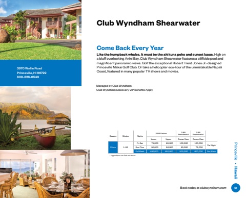 Princeville %u2022 HawaiiClub Wyndham ShearwaterCome Back Every Year Like the humpback whales. It must be the ahi tuna poke and sunset luaus. High on a bluff overlooking Anini Bay, Club Wyndham Shearwater features a cliffside pool and magnificent panoramic views. Golf the exceptional Robert Trent Jones Jr.-designed Princeville Makai Golf Club. Or take a helicopter eco-tour of the unmistakable Napali Coast, featured in many popular TV shows and movies.3970 Wyllie RoadPrinceville, HI 96722808-826-6549Managed by Club WyndhamClub Wyndham Discovery VIP Benefits ApplySeason Weeks Nights2 BR Deluxe 2 BR Presidential3 BR PresidentialLower Upper Ocean View Ocean ViewPrime 1%u201352Fri-Sat 75,000 85,000 100,000 120,000Per NightSun-Thur 50,000 56,000 60,000 72,000Full Week 400,000 450,000 500,000 600,000 Per Week%u2022 Upper fl oors are 2nd and above.Book today at clubwyndham.com 61