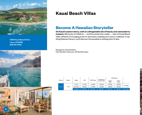 Kauai Beach VillasBecome A Hawaiian StorytellerOn Kauai%u2019s eastern shore, craft an unforgettable tale of beauty and connection to treasure. Memories of a lifetime %u2014 and the stories they create %u2014 start at Kauai Beach Villas. Whether it%u2019s lounging at the on-site beach, heading out to sea in a sailboat, or zip lining Waimea Canyon, you%u2019ll discover this paradise is nothing short of epic. 4330 Kauai Beach DriveLihue, HI 96766808-241-1000Season Weeks Nights 1 BR 1 BR Deluxe 1 BR Deluxe Ocean View2 BR DeluxeLagoonView OceanViewPrime 1%u201352Fri-Sat 41,500 44,500 53,000 62,000 65,000Per NightSun-Thur 24,000 27,000 32,000 36,800 39,000Full Week 203,000 224,000 266,000 308,000 325,000 Per WeekManaged by Club WyndhamClub Wyndham Discovery VIP Benefits Apply62