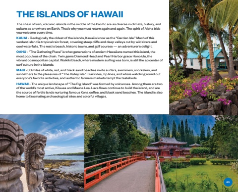 Lihue %u2022 HawaiiTHE ISLANDS OF HAWAIIThe chain of lush, volcanic islands in the middle of the Pacific are as diverse in climate, history, and culture as anywhere on Earth. That%u2019s why you must return again and again. The spirit of Aloha bids you welcome every time. KAUAI - Geologically the oldest of the islands, Kauai is know as the %u201cGarden Isle.%u201d Much of this verdant island is tropical rain forest, covering steep cliffs and deep valleys cut by wild rivers and cool waterfalls. The rest is beach, historic towns, and golf courses %u2014 an adventurer%u2019s delight.OAHU - %u201cThe Gathering Place%u201d is what generations of ancient Hawaiians named this island, the most populous of the chain. Twin gems Diamond Head and Pearl Harbor grace Honolulu, the vibrant cosmopolitan capital. Waikiki Beach, where modern surfing was born, is still the epicenter of surf culture in the islands.MAUI - 30 miles of white, red, and black sand beaches invite surfers, swimmers, snorkelers, and sunbathers to the pleasures of %u201cThe Valley Isle.%u201d Trail rides, zip lines, and whale watching round out everyone%u2019s favorite activities, and authentic farmers markets tempt the tastebuds.HAWAII - The unique landscape of %u201cThe Big Island%u201d was formed by volcanoes. Among them are two of the world%u2019s most active, Kilauea and Mauna Loa. Lava flows continue to build the island, and are the source of fertile lands nurturing famous Kona coffee, and black sand beaches. The island is also home to fascinating archaeological sites and colorful villages.63