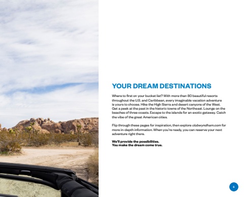 YOUR DREAM DESTINATIONSWhere to first on your bucket list? With more than 80 beautiful resorts throughout the U.S. and Caribbean, every imaginable vacation adventure is yours to choose. Hike the High Sierra and desert canyons of the West.Get a peek at the past in the historic towns of the Northeast. Lounge on the beaches of three coasts. Escape to the islands for an exotic getaway. Catch the vibe of the great American cities.Flip through these pages for inspiration, then explore clubwyndham.com for more in-depth information. When you%u2019re ready, you can reserve your next adventure right there.We%u2019ll provide the possibilities.You make the dream come true.5