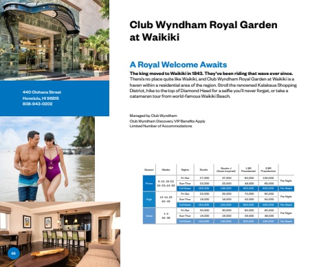 440 Olohana StreetHonolulu, HI 96815808-943-0202Club Wyndham Royal Garden at WaikikiA Royal Welcome AwaitsThe king moved to Waikiki in 1843. They%u2019ve been riding that wave ever since.There%u2019s no place quite like Waikiki, and Club Wyndham Royal Garden at Waikiki is a haven within a residential area of the region. Stroll the renowned Kalakaua Shopping District, hike to the top of Diamond Head for a selfie you%u2019ll never forget, or take a catamaran tour from world-famous Waikiki Beach.Managed by Club WyndhamClub Wyndham Discovery VIP Benefits ApplyLimited Number of AccommodationsSeason Weeks Nights Studio Studio-J (Asian Inspired)1 BRPresidential2 BRPresidentialPrime 5%u201312, 15%u20132224%u201333, 44%u201352Fri-Sat 37,000 37,000 80,000 100,000 Per NightSun-Thur 23,000 23,000 48,000 60,000 Full Week 189,000 189,000 400,000 500,000 Per WeekHigh 13%u201314, 2340%u201343Fri-Sat 32,000 32,000 70,000 90,000Per NightSun-Thur 18,000 18,000 42,000 54,000 Full Week 154,000 154,000 350,000 450,000 Per WeekValue 1%u2013434%u201339Fri-Sat 30,000 30,000 60,000 80,000 Per NightSun-Thur 16,000 16,000 36,000 48,000Full Week 140,000 140,000 300,000 400,000 Per Week68