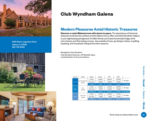 Honolulu %u2022 Hawaii %u2022 Galena %u2022 IllinoisClub Wyndham GalenaModern Pleasures Amid Historic TreasuresDiscover a rustic Midwest town with charm to spare. The abundance of historical sites just scratches the surface of what Galena has to offer, and Club Wyndham Galena is your sightseeing springboard. On Main Street you%u2019ll taste handmade fudge, drink micro brews, and find antique troves. Just outside of town, go skiing in winter, or golfing, kayaking, and horseback riding all the other seasons.5129 West Longhollow RoadGalena, IL 61036815-776-9020Managed by Club WyndhamClub Wyndham Discovery VIP Benefits ApplyLimited Number of AccommodationsSeason Weeks Nights Studio 1 BR 2 BRPrime 13%u201314, 20%u20134251%u201352Fri-Sat 22,900 26,100 32,500Per NightSun-Thur 13,800 15,800 19,800Full Week 114,800 131,200 164,000 Per WeekHigh6%u2013843%u201350Fri-Sat 16,500 19,700 26,100Per NightSun-Thur 9,800 11,800 15,800Full Week 82,000 98,400 131,200 Per WeekValue 1%u20135, 9%u20131215%u201319Fri-Sat 10,100 13,300 19,700Per NightSun-Thur 5,800 7,800 11,800Full Week 49,200 65,600 98,400 Per WeekBook today at clubwyndham.com 69