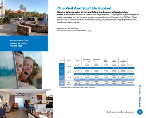 Managed by Club WyndhamClub Wyndham Discovery VIP Benefits Apply110 Willow Bend DriveBranson, MO 65616417-336-4993Branson %u2022 MissouriOne Visit And You%u2019ll Be HookedSeason Weeks NightsStudio Deluxe 1 BR Deluxe 2 BR Deluxe3 BR Deluxe4 BR Presidential 2 BR Lockoff Prime 18%u201343Fri-Sat 18,500 22,500 32,000 41,500 60,000Per Night Sun-Thur 8,000 12,000 18,000 24,000 36,000Full Week 77,000 105,000 154,000 203,000 300,000 Per WeekHigh 14%u20131744%u201350Fri-Sat 14,000 19,500 25,500 35,000 53,000Per Night Sun-Thur 7,000 9,000 15,000 21,000 32,000Full Week 63,000 84,000 126,000 175,000 266,000 Per WeekValue 10%u201313Fri-Sat 13,000 18,500 22,500 32,000 44,500 Per Night Sun-Thur 6,000 8,000 12,000 18,000 27,000Full Week 56,000 77,000 105,000 154,000 224,000 Per WeekQuiet1%u2013951%u201352Fri-Sat 9,500 14,250 18,500 25,500 41,500 Per Night Sun-Thur 6,000 7,500 8,000 15,000 24,000Full Week 49,000 66,000 77,000 126,000 203,000 Per Week%u2022 A Studio Deluxe and a 1 BR Deluxe equals total point value for a 2 BR Lockoff .Hanging its fun on guitar strings and fishing line, Branson will surely strike a chord. Surrender to the natural allure of this singular resort %u2014 highlighted by charming stone walls, clear lakes, and, as its name suggests, mountain vistas. Venture out to 76 Strip, Silver Dollar City, or Table Rock Lake in search of family fun, and then return for big smiles at the on-site recreation center.Book today at clubwyndham.com 79