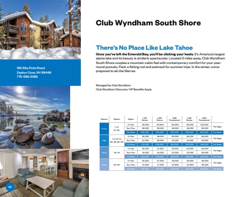 Club Wyndham South Shore180 Elks Point RoadZephyr Cove, NV 89448775-588-2388Managed by Club WyndhamClub Wyndham Discovery VIP Benefits ApplyThere%u2019s No Place Like Lake Tahoe Once you%u2019ve left the Emerald Bay, you%u2019ll be clicking your heels. It%u2019s America%u2019s largest alpine lake and its beauty is similarly spectacular. Located 3 miles away, Club Wyndham South Shore couples a mountain cabin feel with contemporary comfort for your yearround pursuits. Pack a fishing rod and swimsuit for summer trips. In the winter, come prepared to ski the Sierras.Season Weeks Nights 1 BR Deluxe2 BR Deluxe2 BR Presidential3 BR Deluxe3 BR PresidentialPrime 7, 2751%u201352Fri-Sat 49,000 64,500 80,000 80,000 100,000Per NightSun-Thur 28,000 39,000 48,000 48,000 60,000Full Week 238,000 324,000 400,000 400,000 500,000 Per WeekHigh 1%u20136, 8%u20131420%u201326, 28%u201339Fri-Sat 35,000 49,000 65,000 65,000 80,000Per NightSun-Thur 21,000 28,000 34,000 34,000 40,000Full Week 175,000 238,000 300,000 300,000 360,000 Per WeekValue 15%u201319Fri-Sat 32,000 41,500 53,000 53,000 64,500Per NightSun-Thur 18,000 24,000 32,000 32,000 39,000Full Week 154,000 203,000 266,000 266,000 324,000 Per WeekQuiet 40%u201350Fri-Sat 22,500 27,500 38,000 38,000 49,000Per NightSun-Thur 12,000 17,000 22,600 22,600 28,000Full Week 105,000 140,000 189,000 189,000 238,000 Per Week80