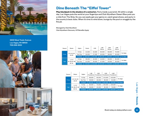 Managed by Club WyndhamClub Wyndham Discovery VIP Benefits Apply3200 West Twain AvenueLas Vegas, NV 89103702-238-1200Las Vegas %u2022 NevadaDine Beneath The %u201cEiffel Tower%u201dSeason Weeks Nights Studio 1 BR 1 BRDeluxe2 BRDeluxe3 BRDeluxePrime 2, 6%u201342, 4649, 52Fri-Sat 41,500 44,500 50,000 60,000 75,000Per NightSun-Thur 24,000 27,000 30,000 36,000 45,000Full Week 203,000 224,000 250,000 300,000 375,000 Per WeekHigh1, 3%u2013543%u201345, 47%u201348 50%u201351Fri-Sat 35,000 42,500 44,500 55,000 65,000Per NightSun-Thur 21,000 25,000 27,000 33,000 39,000Full Week 175,000 210,000 224,000 275,000 325,000 Per WeekSeason Weeks Nights 1 BR Presidential2 BR Presidential3 BR Presidential4 BR PresidentialPrime 2, 6%u201342, 4649, 52Fri-Sat 65,000 80,000 110,000 140,000Per NightSun-Thur 39,000 48,000 66,000 84,000Full Week 325,000 400,000 550,000 700,000 Per WeekHigh1, 3%u2013543%u201345, 47%u201348 50%u201351Fri-Sat 60,000 70,000 100,000 125,000Per NightSun-Thur 36,000 42,000 60,000 75,000Full Week 300,000 350,000 500,000 625,000 Per WeekPlay blackjack in the shadow of a centurion. Party inside a pyramid. All within a single day. Las Vegas puts the world at your fingertips and Club Wyndham Desert Blue puts you a mile from The Strip. So you can easily get your game on, catch great shows, and party in the country%u2019s best clubs. When it%u2019s time to wind down, lounge by the pool or snuggle by the fire pit.Book today at clubwyndham.com 83