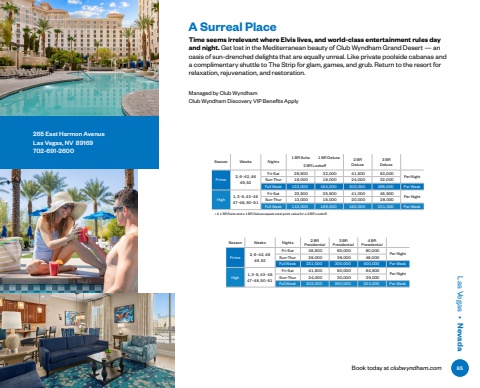 Managed by Club WyndhamClub Wyndham Discovery VIP Benefits Apply265 East Harmon AvenueLas Vegas, NV 89169702-691-2600Las Vegas %u2022 NevadaA Surreal PlaceSeason Weeks Nights1 BR Suite 1 BR Deluxe 2 BR Deluxe3 BR Deluxe 2 BR Lockoff Prime 2, 6%u201342, 4649, 52Fri-Sat 26,500 32,000 41,500 53,000Per Night Sun-Thur 16,000 18,000 24,000 32,000Full Week 133,000 154,000 203,000 266,000 Per WeekHigh 1, 3%u20135, 43%u20134547%u201348, 50%u201351Fri-Sat 23,500 25,500 41,000 45,500Per Night Sun-Thur 13,000 15,000 20,000 28,000Full Week 112,000 126,000 182,000 231,000 Per Week%u2022 A 1 BR Suite and a 1 BR Deluxe equals total point value for a 2 BR Lockoff .Season Weeks Nights 2 BR Presidential3 BR Presidential4 BR PresidentialPrime 2, 6%u201342, 4649, 52Fri-Sat 45,500 60,000 80,000Per Night Sun-Thur 28,000 36,000 48,000Full Week 231,000 300,000 400,000 Per WeekHigh 1, 3%u20135, 43%u20134547%u201348, 50%u201351Fri-Sat 41,500 50,000 64,500Per Night Sun-Thur 24,000 30,000 39,000Full Week 203,000 250,000 324,000 Per WeekTime seems irrelevant where Elvis lives, and world-class entertainment rules day and night. Get lost in the Mediterranean beauty of Club Wyndham Grand Desert %u2014 an oasis of sun-drenched delights that are equally unreal. Like private poolside cabanas and a complimentary shuttle to The Strip for glam, games, and grub. Return to the resort for relaxation, rejuvenation, and restoration.Book today at clubwyndham.com 85
